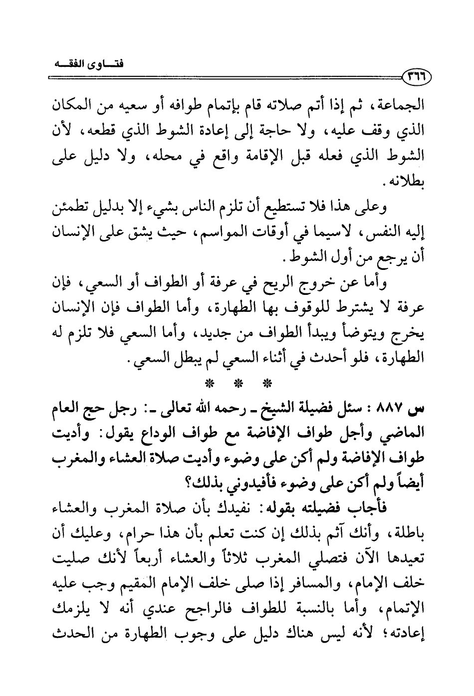 س 887: سئل فضيلة الشيخ- رحمه الله تعالى-: رجل حج العام الماضي وأجل طواف الإفاضة مع طواف الوداع يقول: وأديت طواف الإفاضة ولم أكن على وضوء وأديت صلاة العشاء والمغرب