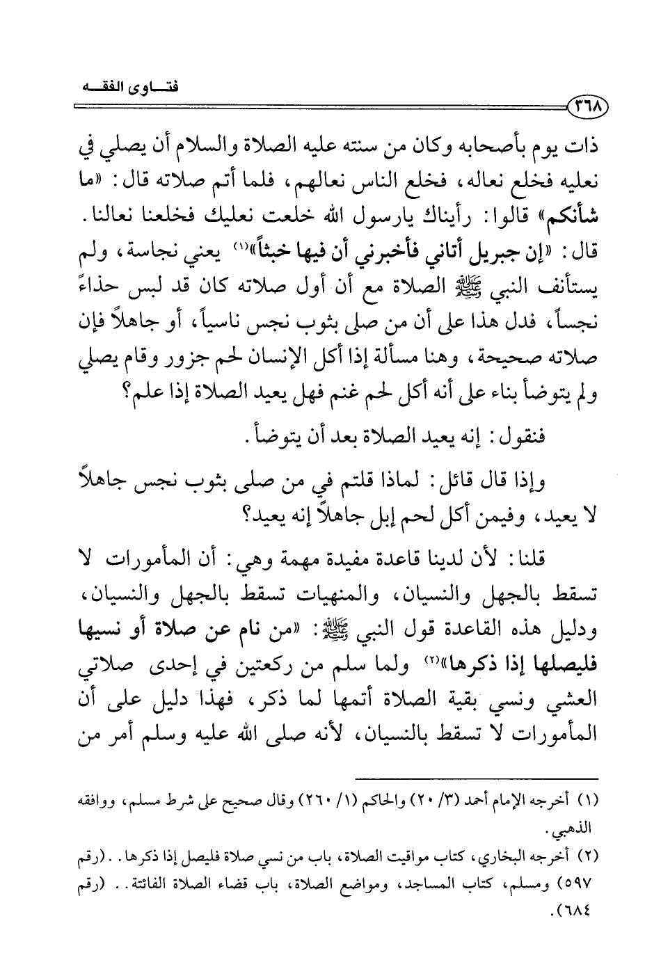 قلنا: لأن لدينا قاعدة مفيدة مهمة وهي: أن المأمورات لا تسقط بالجهل والنسيان، والمنهيات تسقط بالجهل والنسيان، ودليل هذه القاعدة قول النبي - صلى الله عليه وسلم -: "من نام عن صلاة أو نسيها فليصلها إذا ذكرها" (2) ولما سلم من ركعتين في إحدى صلاتي العشي ونسي بقية الصلاة أتمها لما ذكر، فهذا دليل على أن المأمورات لا تسقط بالنسيان، لأنه صلى الله عليه وسلم أمر من
