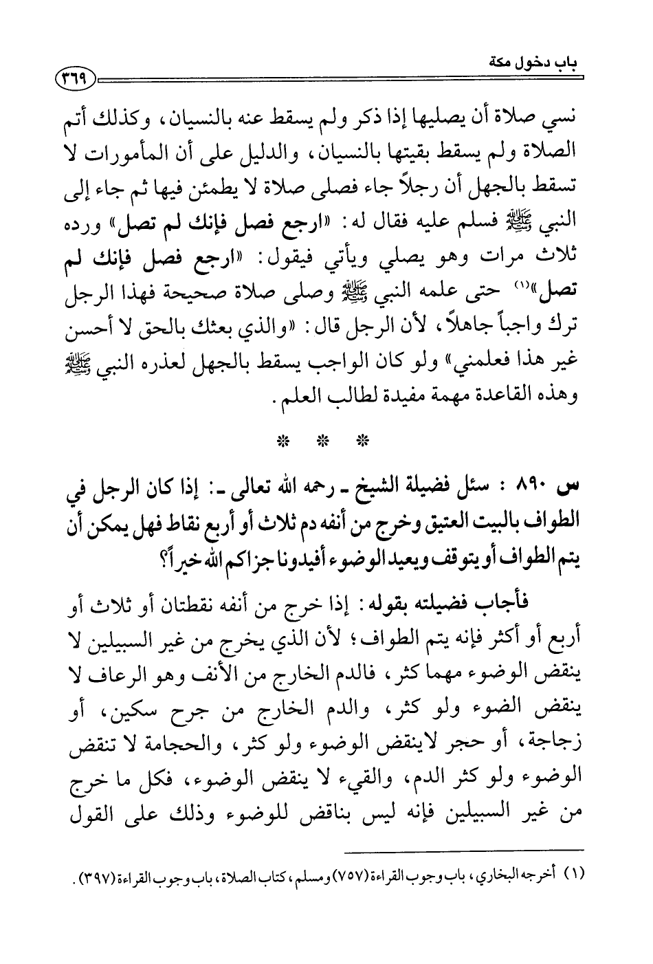 س 890: سئل فضيلة الشيخ- رحمه الله تعالى-: إذا كان الرجل في الطواف بالبيت العتيق وخرج من أنفه دم ثلاث أو أربع نقاط فهل يمكن أن يتم الطواف أو يتوقف ويعيد الوضوء أفيدونا جزاكم الله خيراً؟