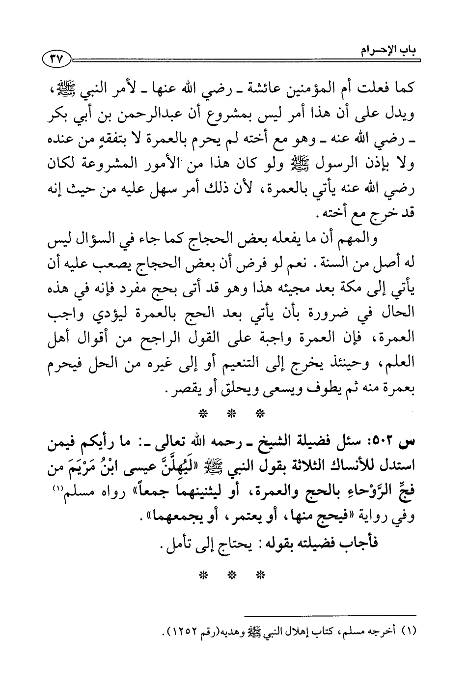 كما فعلت أم المؤمنين عائشة- رضي الله عنها- لأمر النبي - صلى الله عليه وسلم -، ويدل على أن هذا أمر ليس بمشروع أن عبد الرحمن بن أبي بكر - رضي الله عنه- وهو مع أخته لم يحرم بالعمرة لا بتفقهٍ من عنده ولا بإذن الرسول - صلى الله عليه وسلم - ولو كان هذا من الأمور المشروعة لكان رضي الله عنه يأتي بالعمرة، لأن ذلك أمر سهل عليه من حيث إنه قد خرج مع أخته.