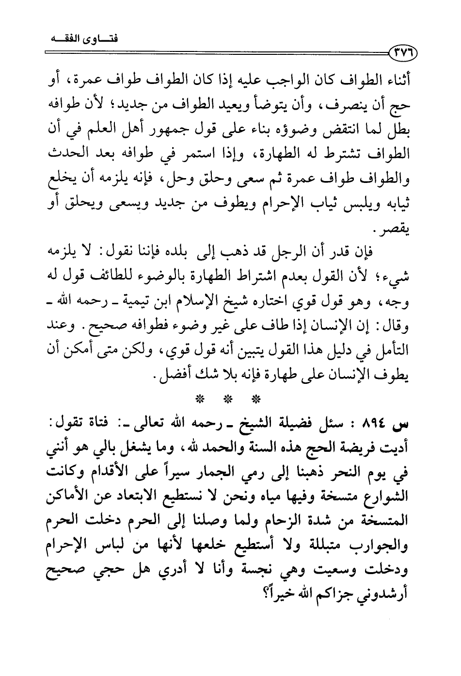 س 894: سئل فضيلة الشيخ- رحمه الله تعالى-: فتاة تقول: أديت فريضة الحج هذه السنة والحمد لله، وما يشغل بالي هو أنني في يوم النحر ذهبنا إلى رمي الجمار سيراً على الأقدام وكانت الشوارع متسخة وفيها مياه ونحن لا نستطيع الابتعاد عن الأماكن المتسخة من شدة الزحام ولما وصلنا إلى الحرم دخلت الحرم والجوارب متبللة ولا أستطيع خلعها لأنها من لباس الإحرام ودخلت وسعيت وهي نجسة وأنا لا أدري هل حجي صحيح أرشدوني جزاكم الله خيراً؟