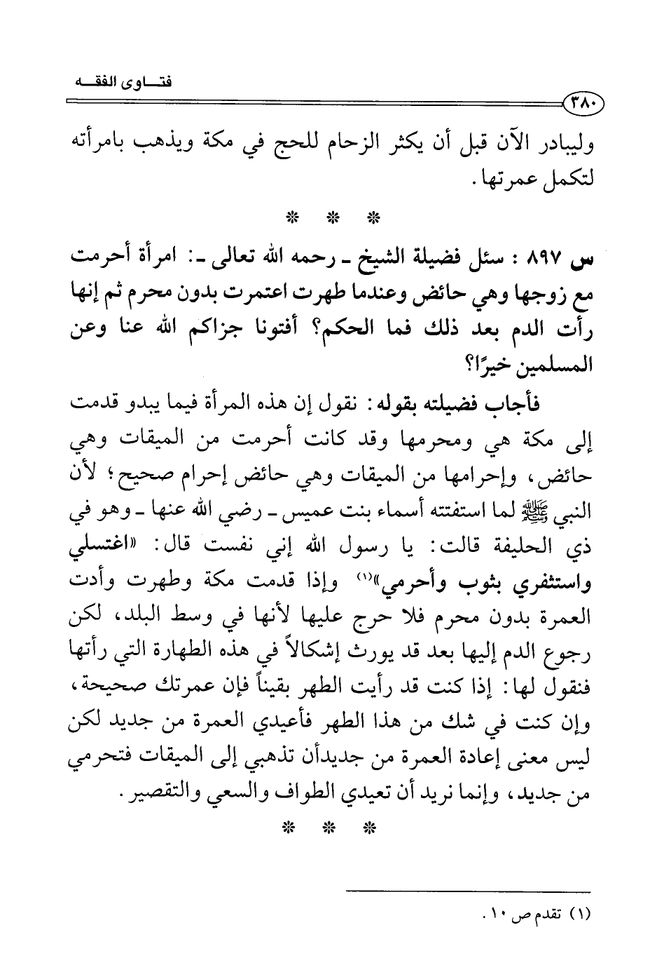 فأجاب فضيلته بقوله: نقول إن هذه المرأة فيما يبدو قدمت إلى مكة هي ومحرمها وقد كانت أحرمت من الميقات وهي حائض، وإحرامها من الميقات وهي حائض إحرام صحيح؛ لأن النبي - صلى الله عليه وسلم - لما استفتته أسماء بنت عميس- رضي الله عنها- وهو في ذي الحليفة قالت: يا رسول الله إني نفست قال: "اغتسلي واستثفري بثوب وأحرمي " (1) وإذا قدمت مكة وطهرت وأدت العمرة بدون محرم فلا حرج عليها لأنها في وسط البلد، لكن رجوع الدم إليها بعد قد يورث إشكالاً في هذه الطهارة التي رأتها فنقول لها: إذا كنت قد رأيت الطهر يقيناً فإن عمرتك صحيحة،