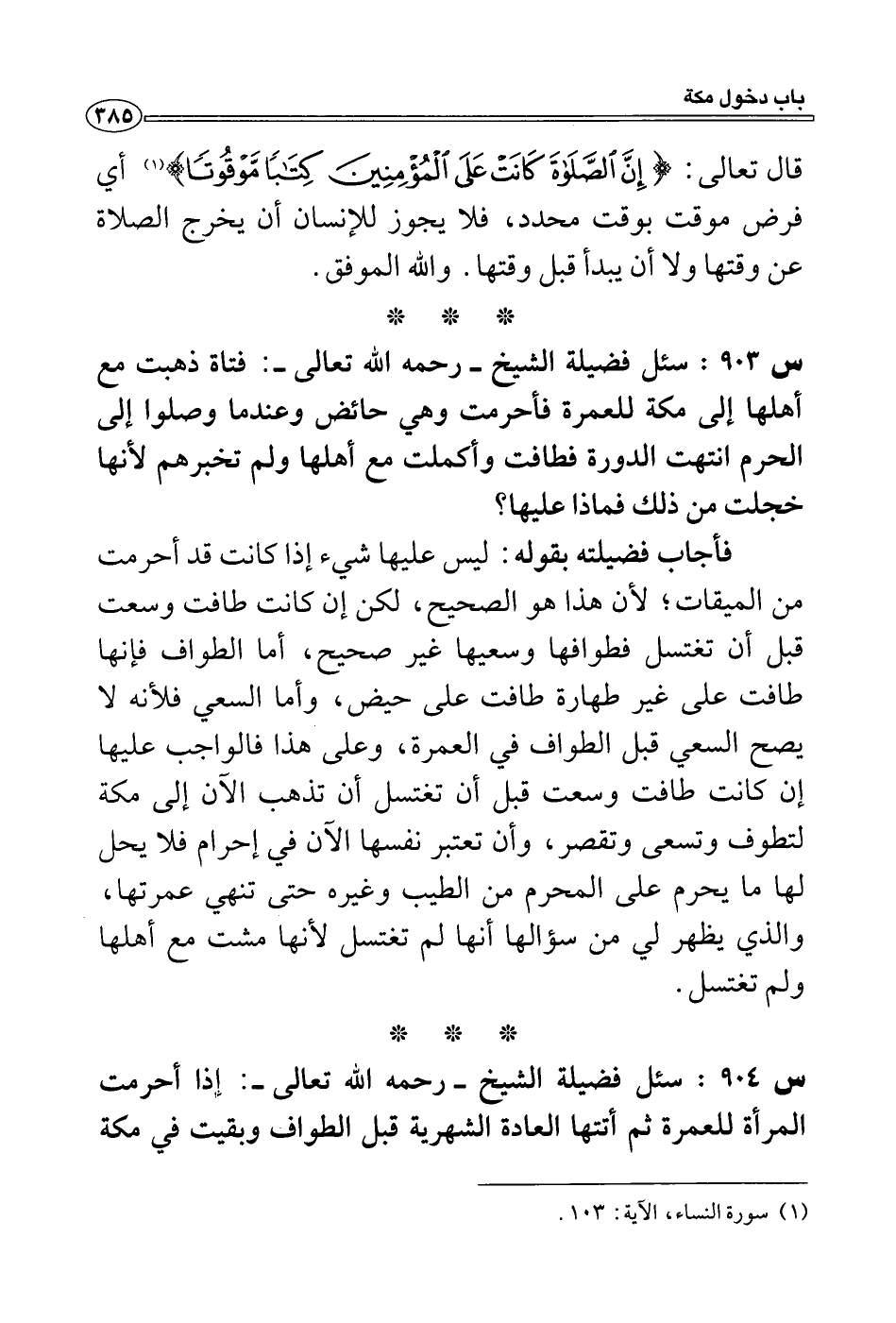 س 904: سئل فضيلة الشيخ- رحمه الله تعالى-: إذا أحرمت المرأة للعمرة ثم أتتها العادة الشهرية قبل الطواف وبقيت في مكة