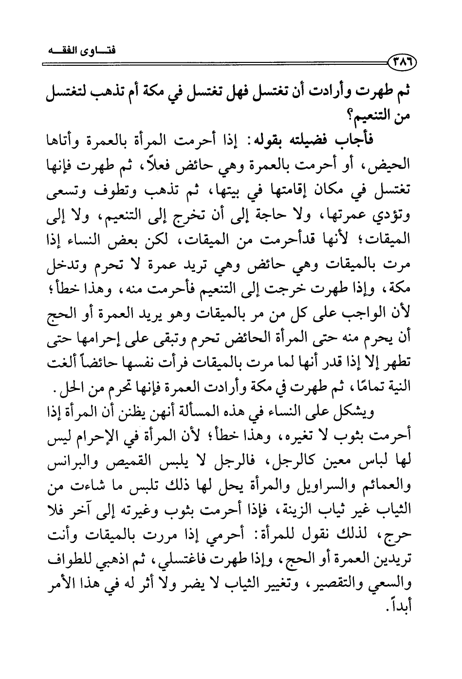 فأجاب فضيلته بقوله: إذا أحرمت المرأة بالعمرة وأتاها الحيض، أو أحرمت بالعمرة وهي حائض فعلاً، ثم طهرت فإنها تغتسل في مكان إقامتها في بيتها، ثم تذهب وتطوف وتسعى وتؤدي عمرتها، ولا حاجة إلى أن تخرج إلى التنعيم، ولا إلى الميقات؛ لأنها قد أحرمت من الميقات، لكن بعض النساء إذا مرت بالميقات وهي حائض وهي تريد عمرة لا تحرم وتدخل مكة، وإذا طهرت خرجت إلى التنعيم فأحرمت منه، وهذا خطأ؛ لأن الواجب على كل من مر بالميقات وهو يريد العمرة أو الحج