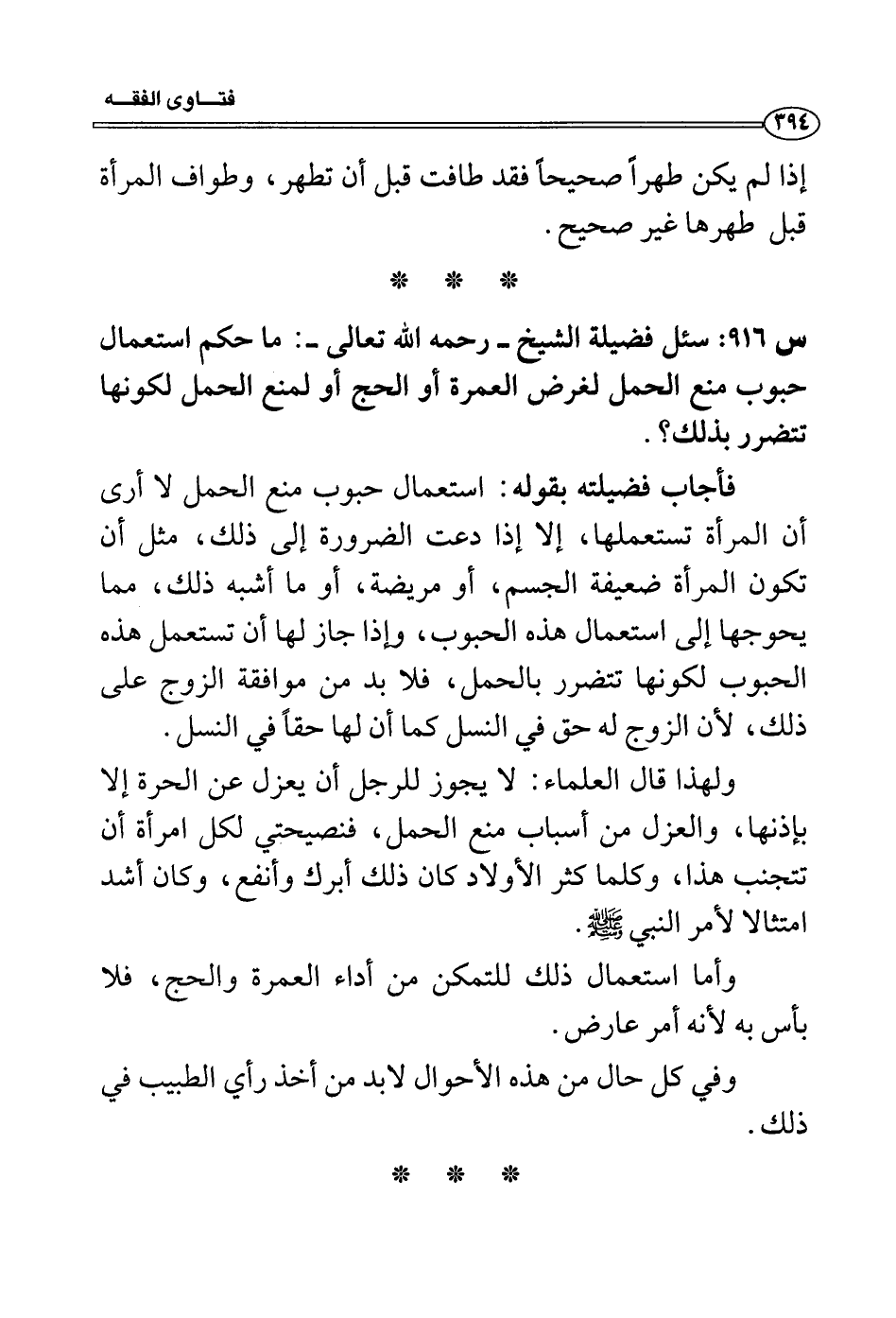 س 916: سئل فضيلة الشيخ- رحمه الله تعالى-: ما حكم استعمال حبوب منع الحمل لغرض العمرة أو الحج أو لمنع الحمل لكونها تتضرر بذلك؟.