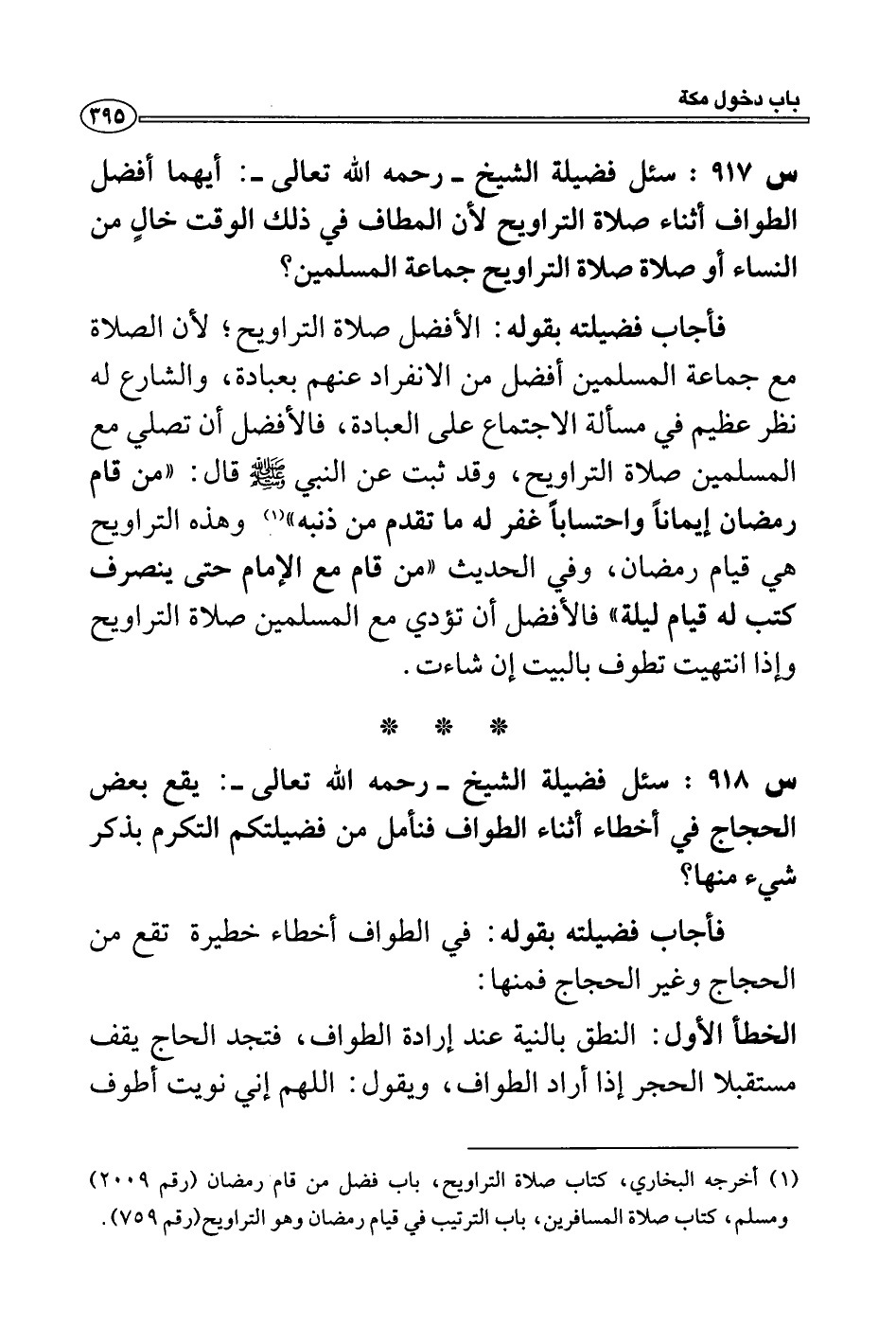 س 917: سئل فضيلة الشيخ- رحمه الله تعالى-: أيهما أفضل الطواف أثناء صلاة التراويح لأن المطاف في ذلك الوقت خالٍ من النساء أو صلاة صلاة التراويح جماعة المسلمين؟