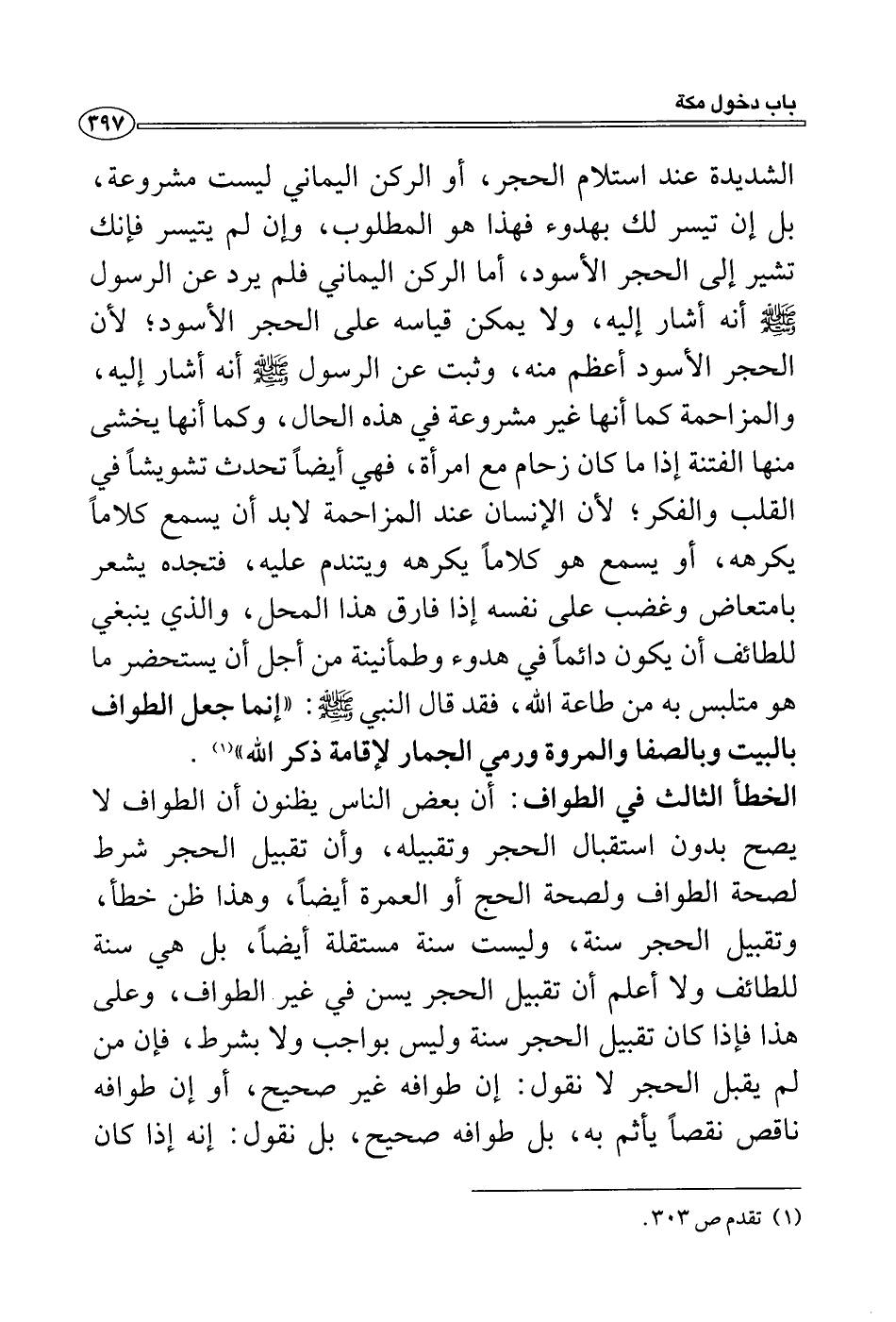 - صلى الله عليه وسلم - أنه أشار إليه، ولا يمكن قياسه على الحجر الأسود؛ لأن الحجر الأسود أعظم منه، وثبت عن الرسول - صلى الله عليه وسلم - أنه أشار إليه، والمزاحمة كما أنها غير مشروعة في هذه الحال، وكما أنها يخشى منها الفتنة إذا ما كان زحام مع امرأة، فهي أيضاً تحدث تشويشاً في القلب والفكر؛ لأن الإنسان عند المزاحمة لابد أن يسمع كلاماً يكرهه، أو يسمع هو كلاماً يكرهه ويتندم عليه، فتجده يشعر بامتعاض وغضب على نفسه إذا فارق هذا المحل، والذي ينبغي للطائف أن يكون دائماً في هدوء وطمأنينة من أجل أن يستحضر ما هو متلبس به من طاعة الله، فقد قال النبي - صلى الله عليه وسلم -: " إنما جعل الطواف بالبيت وبالصفا والمروة ورمي الجمار لإقامة ذكر الله " (1) .