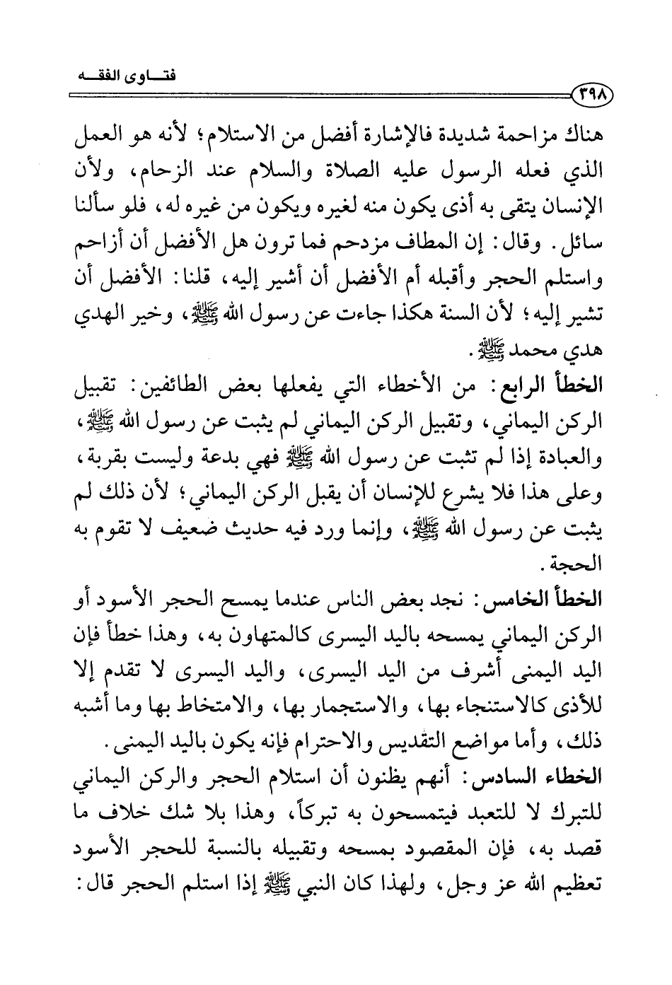 الخطأ الخامس: نجد بعض الناس عندما يمسح الحجر الأسود أو الركن اليماني يمسحه باليد اليسرى كالمتهاون به، وهذا خطأ فإن اليد اليمنى أشرف من اليد اليسرى، واليد اليسرى لا تقدم إلا للأذى كالاستنجاء بها، والاستجمار بها، والامتخاط بها وما أشبه ذلك، وأما مواضع التقديس والاحترام فإنه يكون باليد اليمنى.