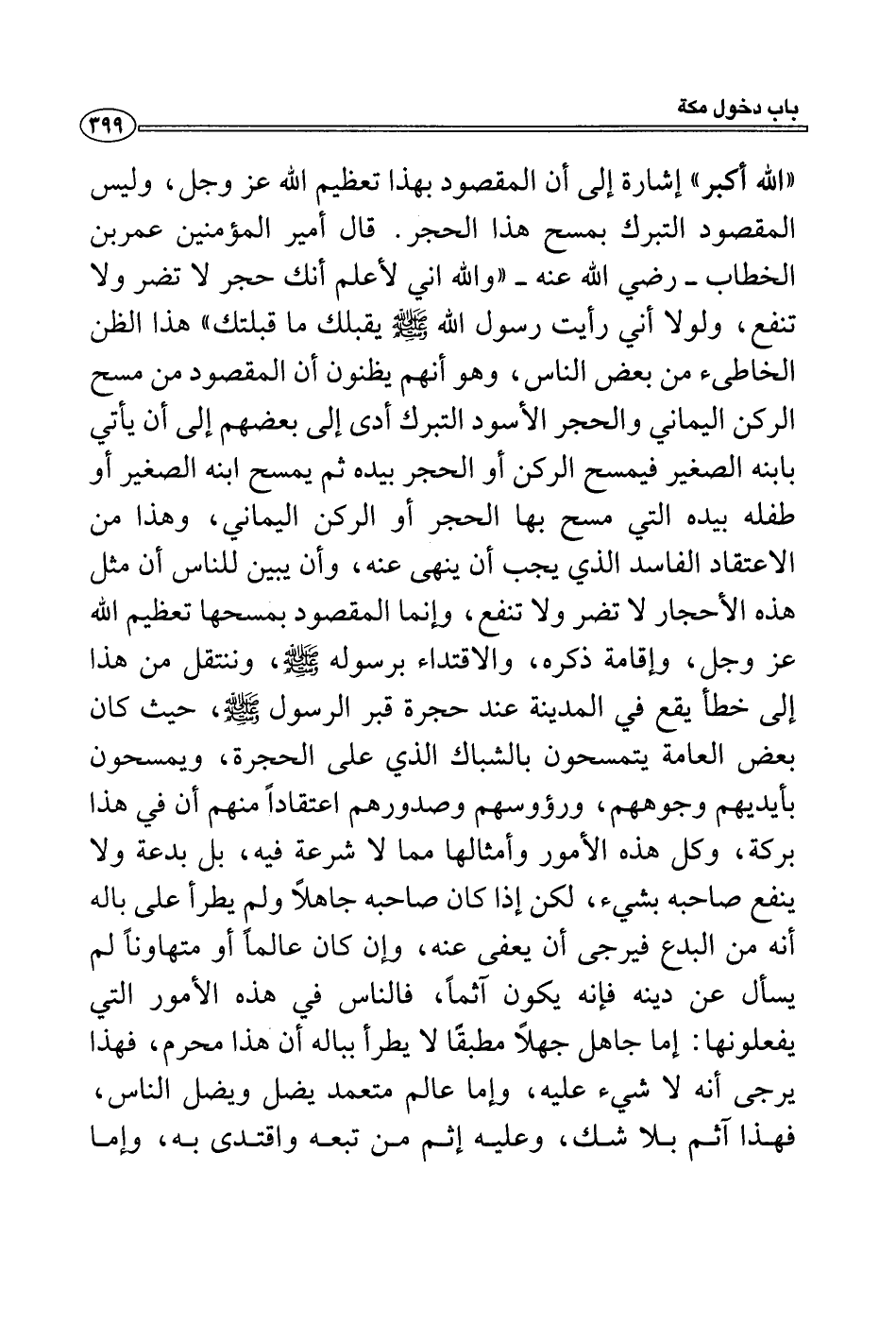 "الله أكبر" إشارة إلى أن المقصود بهذا تعظيم الله عز وجل، وليس المقصود التبرك بمسح هذا الحجر. قال أمير المؤمنين عمر بن الخطاب- رضي الله عنه- "والله إني لأعلم أنك حجر لا تضر ولا تنفع، ولولا أني رأيت رسول الله - صلى الله عليه وسلم - يقبلك ما قبلتك " هذا الظن الخاطىء من بعض الناس، وهو أنهم يظنون أن المقصود من مسح الركن اليماني والحجر الأسود التبرك أدى إلى بعضهم إلى أن يأتي بابنه الصغير فيمسح الركن أو الحجر بيده ثم يمسح ابنه الصغير أو طفله بيده التي مسح بها الحجر أو الركن اليماني، وهذا من الاعتقاد الفاسد الذي يجب أن ينهى عنه، وأن يبين للناس أن مثل هذه الأحجار لا تضر ولا تنفع، وإنما المقصود بمسحها تعظيم الله عز وجل، وإقامة ذكره، والاقتداء برسوله - صلى الله عليه وسلم -، وننتقل من هذا إلى خطأ يقع في المدينة عند حجرة قبر الرسول - صلى الله عليه وسلم -، حيث كان بعض العامة يتمسحون بالشباك الذي على الحجرة، ويمسحون بأيديهم وجوههم، ورؤوسهم وصدورهم اعتقاداً منهم أن في هذا بركة، وكل هذه الأمور وأمثالها مما لا شرعة فيه، بل بدعة ولا ينفع صاحبه بشيء، لكن إذا كان صاحبه جاهلاً ولم يطرأ على باله أنه من البدع فيرجى أن يعفى عنه، وإن كان عالماً أو متهاوناً لم يسأل عن دينه فإنه يكون آثماً، فالناس في هذه الأمور التي يفعلونها: إما جاهل جهلًا مطبقًا لا يطرأ بباله أن هذا محرم، فهذا يرجى أنه لا شيء عليه، وإما عالم متعمد يضل ويضل الناس، فهذا آثم بلا شك، وعليه إثم من تبعه واقتدى به، وإما