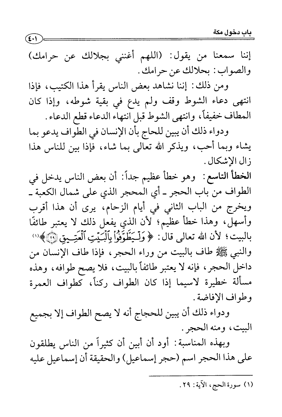 الخطأ التاسع: وهو خطأ عظيم جداً: أن بعض الناس يدخل في الطواف من باب الحجر- أي المحجر الذي على شمال الكعبة- ويخرج من الباب الثاني في أيام الزحام، يرى أن هذا أقرب وأسهل، وهذا خطأ عظيم؛ لأن الذي يفعل ذلك لا يعتبر طائفًا بالبيت؟ لأن الله تعالى قال: (وَلْيَطَّوَّفُوا بِالْبَيْتِ الْعَتِيقِ (29)) (1) والنبي - صلى الله عليه وسلم - طاف بالبيت من وراء الحجر، فإذا طاف الإنسان من داخل الحجر، فإنه لا يعتبر طائفاً بالبيت، فلا يصح طوافه، وهذه مسألة خطيرة لاسيما إذا كان الطواف ركناً، كطواف العمرة وطواف الإفاضة.