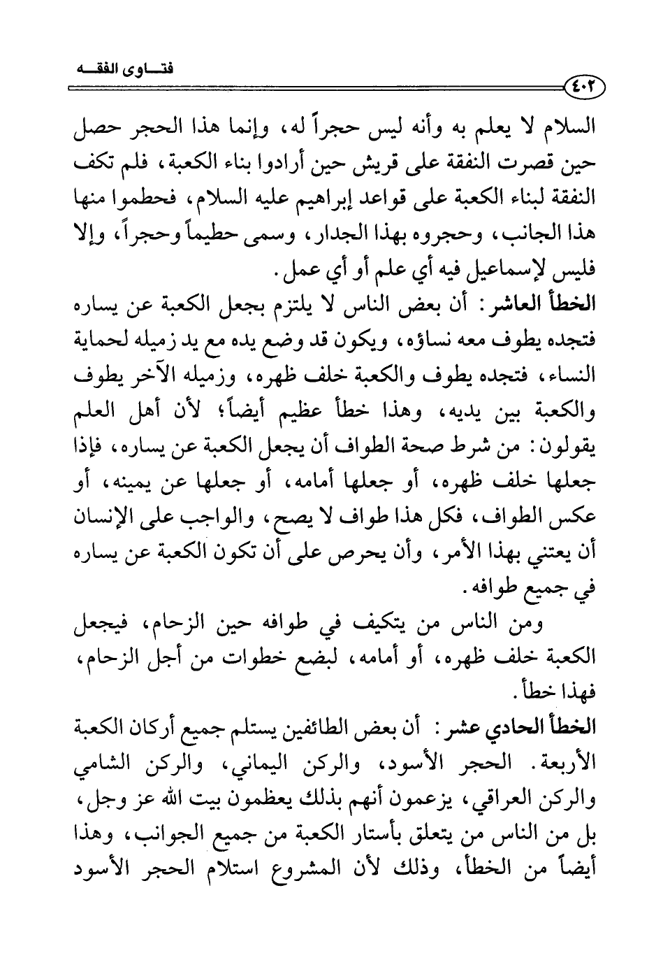 الخطأ العاشر. أن بعض الناس لا يلتزم بجعل الكعبة عن يساره فتجده يطوف معه نساؤه، ويكون قد وضع يده مع يد زميله لحماية النساء، فتجده يطوف والكعبة خلف ظهره، وزميله الآخر يطوف