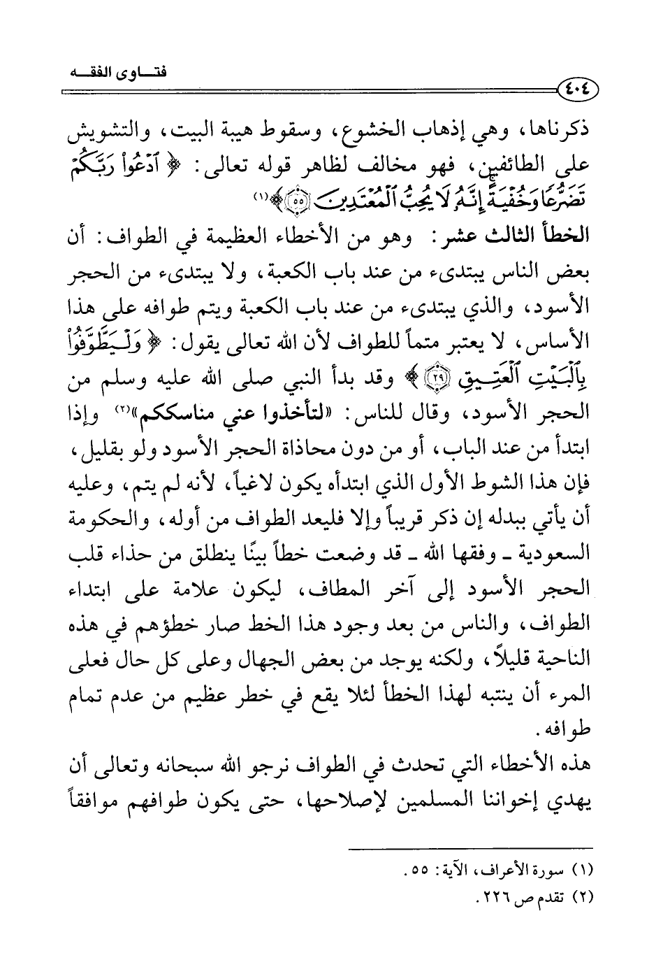 ذكرناها، وهي إذهاب الخشوع، وسقوط هيبة البيت، والتشويش على الطائفين، فهو مخالف لظاهر قوله تعالى: (ادْعُوا رَبَّكُمْ تَضَرُّعًا وَخُفْيَةً إِنَّهُ لَا يُحِبُّ الْمُعْتَدِينَ (55)) (1) الخطأ الثالث عشر: وهو من الأخطاء العظيمة في الطواف: أن بعض الناس يبتدىء من عند باب الكعبة، ولا يبتدىء من الحجر الأسود، والذي يبتدىء من عند باب الكعبة ويتم طوافه على هذا الأساس، لا يعتبر متماً للطواف لأن الله تعالى يقول: (وَلْيَطَّوَّفُوا بِالْبَيْتِ الْعَتِيقِ) وقد بدأ النبي صلى الله عليه وسلم من الحجر الأسود، وقال للناس: "لتأخذوا عني مناسككم " (2) وإذا ابتدأ من عند الباب، أو من دون محاذاة الحجر الأسود ولو بقليل، فإن هذا الشوط الأول الذي ابتدأه يكون لاغياً، لأنه لم يتم، وعليه