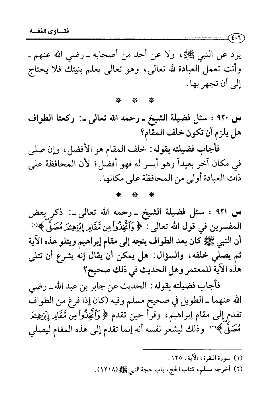 فأجاب فضيلته بقوله: الحديث عن جابر بن عبد الله- رضي الله عنهما- الطويل في صحيح مسلم وفيه (كان إذا فرغ من الطواف تقدم إلى مقام إبراهيم، وقرأ حين تقدم (وَاتَّخِذُوا مِنْ مَقَامِ إِبْرَاهِيمَ مُصَلًّى) (2) وذلك ليشعر نفسه أنه إنما تقدم إلى هذه المقام ليصلي
