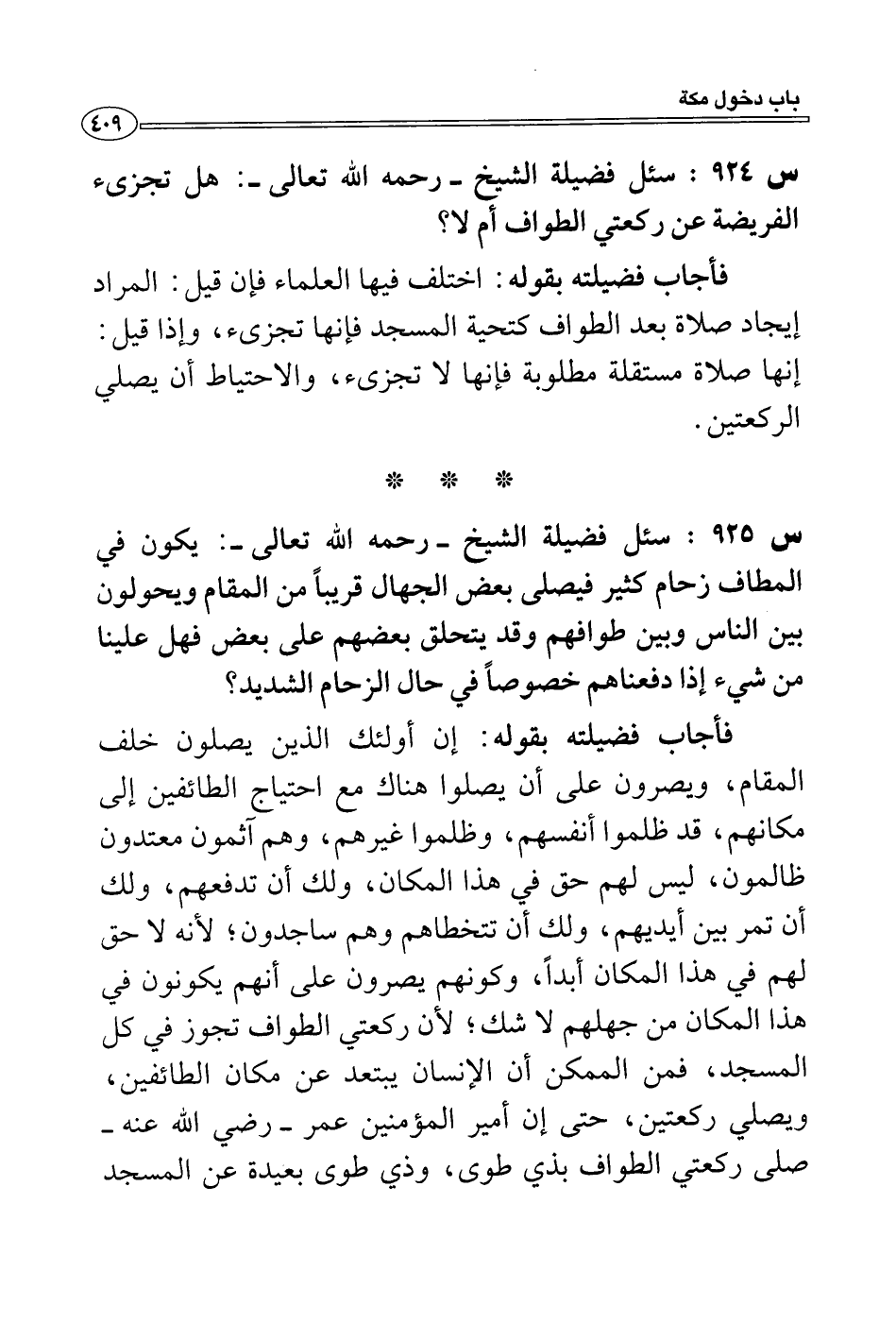 س 925: سئل فضيلة الشيخ- رحمه الله تعالى-: يكون في المطاف زحام كثير فيصلى بعض الجهال قريباً من المقام ويحولون بين الناس وبين طوافهم وقد يتحلق بعضهم على بعض فهل علينا من شيء إذا دفعناهم خصوصاً في حال الزحام الشديد؟