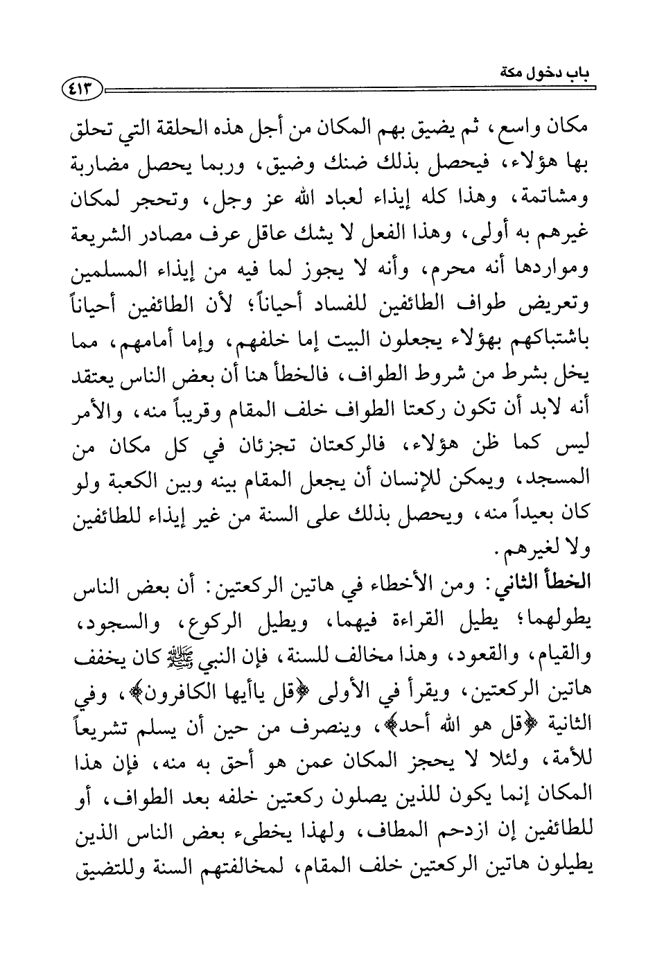 أنه لابد أن تكون ركعتا الطواف خلف المقام وقريباً منه، والأمر ليس كما ظن هؤلاء، فالركعتان تجزئان في كل مكان من المسجد، ويمكن للإنسان أن يجعل المقام بينه وبين الكعبة ولو كان بعيداً منه، ويحصل بذلك على السنة من غير إيذاء للطائفين ولا لغيرهم.