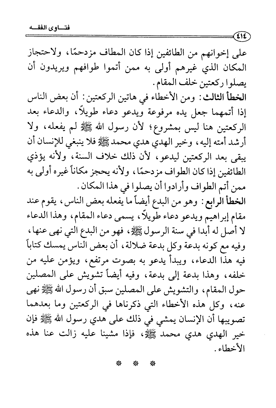 الخطأ الثالث: ومن الأخطاء في هاتين الركعتين: أن بعض الناس إذا أتمهما جع يده مرفوعة ويدعو دعاء طويلاً، والدعاء بعد الركعتين هنا ليس بمشروع؛ لأن رسول الله - صلى الله عليه وسلم - لم يفعله، ولا أرشد أمته إليه، وخير الهدي هدي محمد - صلى الله عليه وسلم - فلا ينبغي للإنسان أن يبقى بعد الركعتين ليدعو، لأن ذلك خلاف السنة، ولأنه يؤذي الطائفين إذا كان الطواف مزدحمًا، ولأنه يحجز مكاناً غيره أولى به ممن أتم الطواف وأرادوا أن يصلوا في هذا المكان.