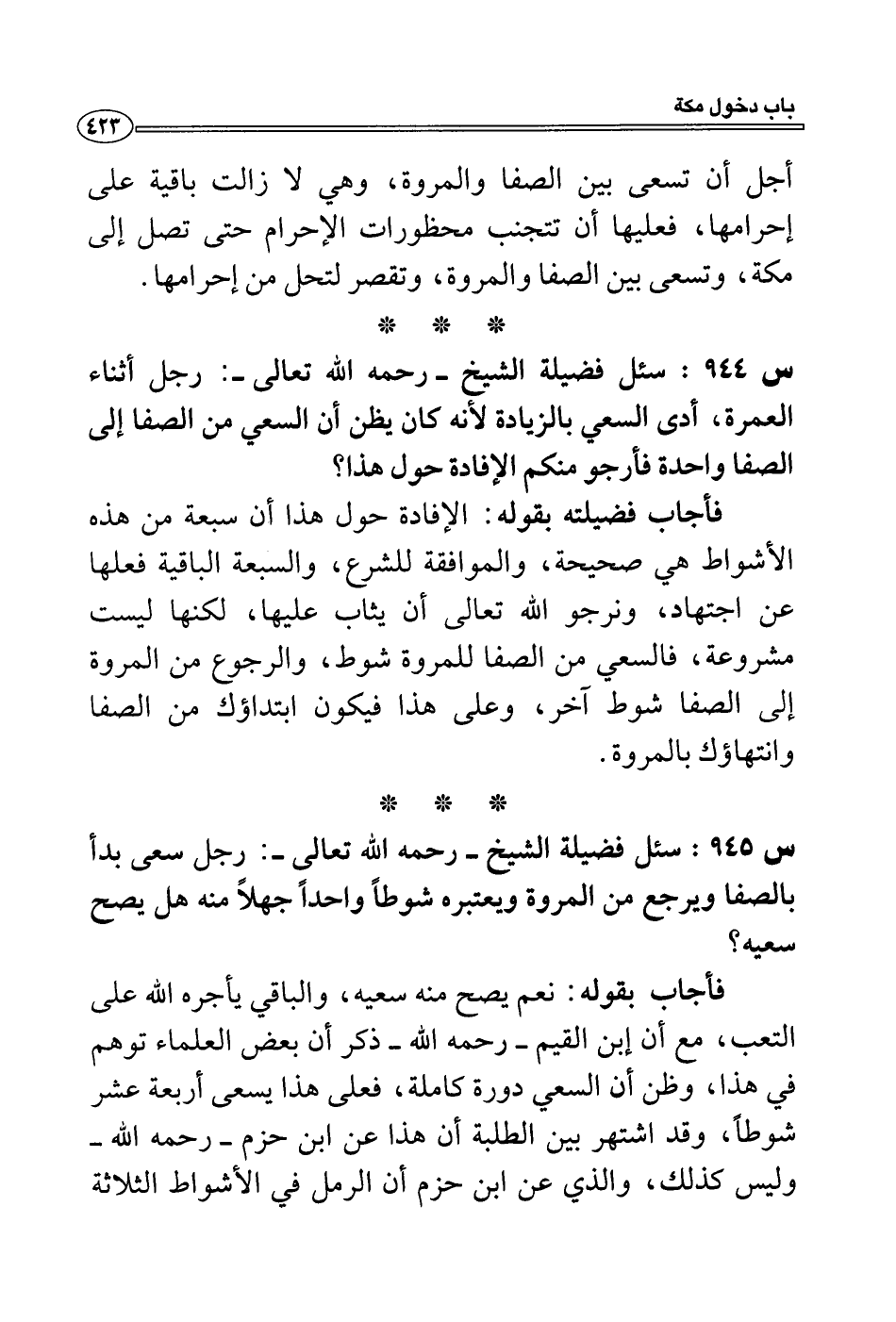 س 944: سئل فضيلة الشيخ- رحمه الله تعالى-: رجل أثناء العمرة، أدى السعي بالزيادة لأنه كان يظن أن السعي من الصفا إلى الصفا واحدة فأرجو منكم الإفادة حول هذا؟