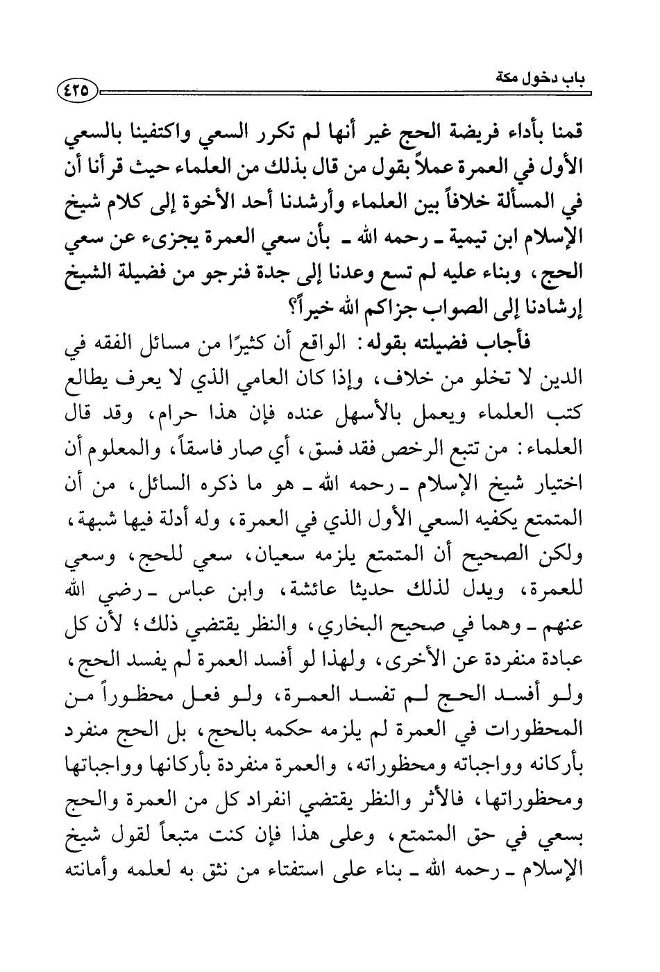 فأجاب فضيلته بقوله: الواقع أن كثيرًا من مسائل الفقه في الدين لا تخلو من خلاف، وإذا كان العامي الذي لا يعرف يطالع كتب العلماء ويعمل بالأسهل عنده فإن هذا حرام، وقد قال العلماء: من تتبع الرخص فقد فسق، أي صار فاسقاً، والمعلوم أن اختيار شيخ الإسلام- رحمه الله- هو ما ذكره السائل، من أن المتمتع يكفيه السعي الأول الذي في العمرة، وله أدلة فيها شبهة، ولكن الصحيح أن المتمتع يلزمه سعيان، سعي للحج، وسعي للعمرة، ويدل لذلك حديثا عائشة، وابن عباس- رضي الله عنهم- وهما في صحيح البخاري، والنظر يقتضي ذلك؛ لأن كل عبادة منفردة عن الأخرى، ولهذا لو أفسد العمرة لم يفسد الحج، ولو أفسد الحج لم تفسد العمرة، ولو فعل محظوراً من المحظورات في العمرة لم يلزمه حكمه بالحج، بل الحج منفرد بأركانه وواجباته ومحظوراته، والعمرة منفردة بأركانها وواجباتها ومحظوراتها، فالأثر والنظر يقتضي انفراد كل من العمرة والحج