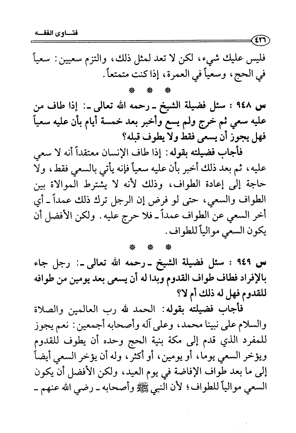 س 949: سئل فضيلة الشيخ -رحمه الله تعالى-: رجل جاء بالإفراد فطاف طواف القدوم وبدا له أن يسعى بعد يومين من طوافه للقدوم فهل له ذلك أم لا؟