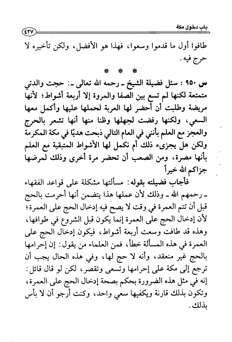 س 950: سئل فضيلة الشيخ- رحمه الله تعالى-: حجت والدتي متمتعة لكنها لم تسع بين الصفا والمروة إلا أربعة أشواط؛ لأنها مريضة وطلبت أن أحضر لها العربة لحملها عليها وأكمل معها