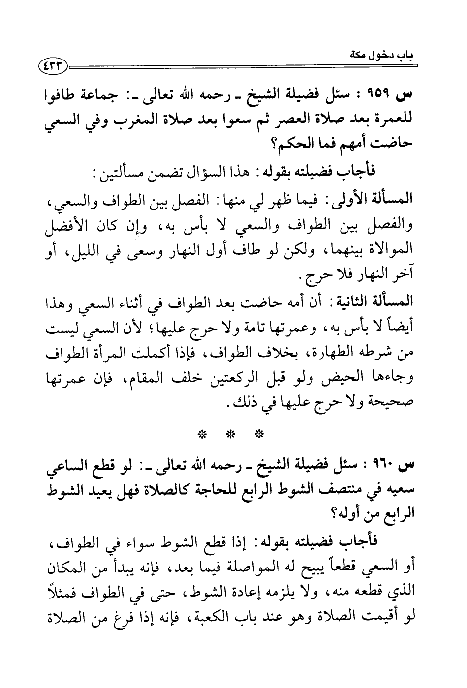 س 959: سئل فضيلة الشيخ- رحمه الله تعالى-: جماعة طافوا للعمرة بعد صلاة العصر ثم سعوا بعد صلاة المغرب وفي السعي حاضت أمهم فما الحكم؟