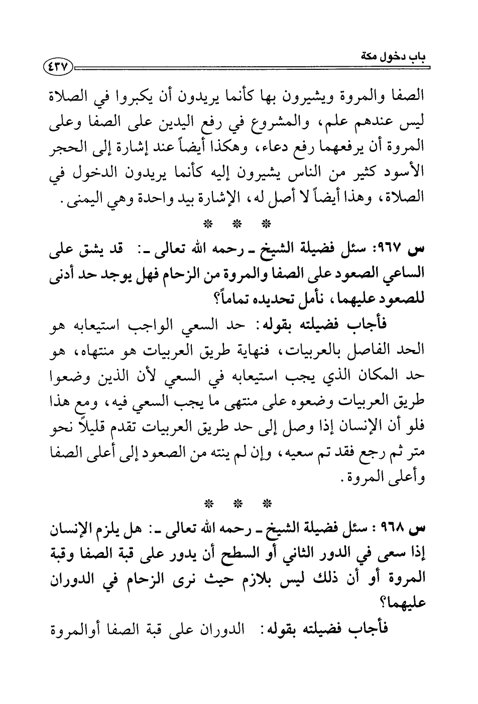 فأجاب فضيلته بقوله: حد السعي الواجب استيعابه هو الحد الفاصل بالعربيات، فنهاية طريق العربيات هو منتهاه، هو حد المكان الذي يجما استيعابه في السعي لأن الذين وضعوا طريق العربيات وضعوه على منتهى ما يجب السعي فيه، ومع هذا فلو أن الإنسان إذا وصل إلى حد طريق العربيات تقدم قليلاً نحو متر ثم رجع فقد تم سعيه، وإن لم ينته من الصعود إلى أعلى الصفا وأعلى المروة.
