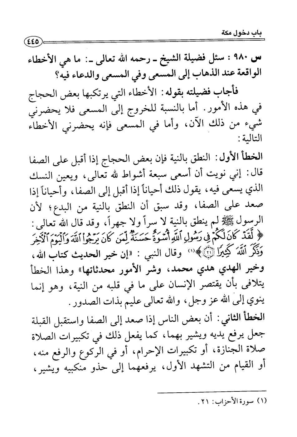س 980: سئل فضيلة الشيخ- رحمه الله تعالى-: ما هي الأخطاء الواقعة عند الذهاب إلى المسعى وفي المسعى والدعاء فيه؟