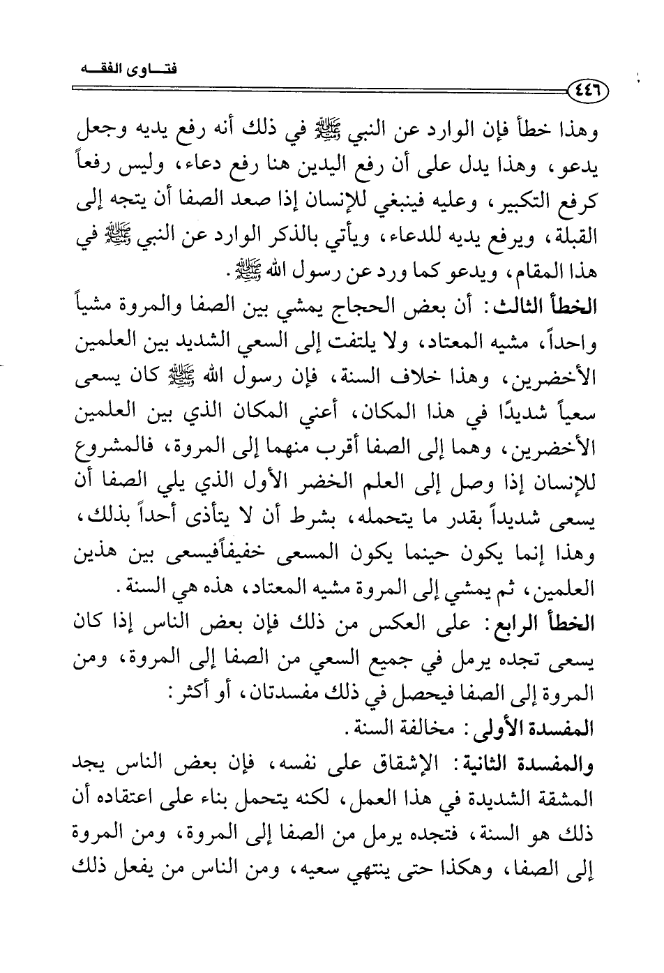 الخطأ الثالث: أن بعض الحجاج يمشي بين الصفا والمروة مشياً واحداً، مشيه المعتاد، ولا يلتفت إلى السعي الشديد بين العلمين الأخضرين، وهذا خلاف السنة، فإن رسول الله - صلى الله عليه وسلم - كان يسعى سعياً شديدًا في هذا المكان، أعني المكان الذي بين العلمين الأخضرين، وهما إلى الصفا أقرب منهما إلى المروة، فالمشروع للإنسان إذا وصل إلى العلم الخضر الأول الذي يلي الصفا أن