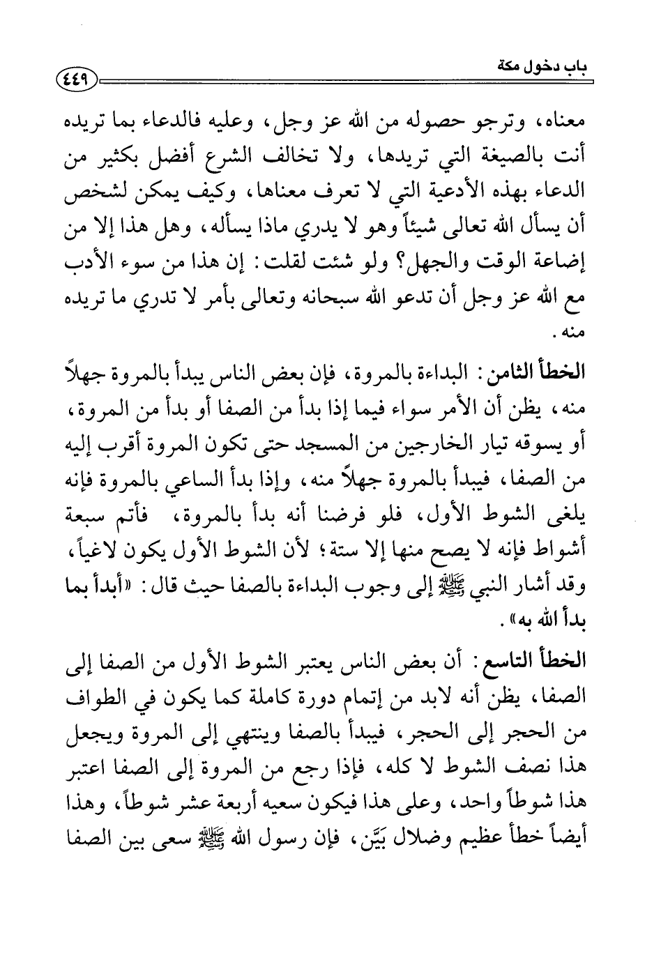 الخطأ الثامن: البداءة بالمروة، فإن بعض الناس يبدأ بالمروة جهلاً منه، يظن أن الأمر سواء فيما إذا بدأ من الصفا أو بدأ من المروة، أو يسوقه تيار الخارجين من المسجد حتى تكون المروة أقرب إليه من الصفا، فيبدأ بالمروة جهلاً منه، وإذا بدأ الساعي بالمروة فإنه يلغى الشوط الأول، فلو فرضنا أنه بدأ بالمروة، فأتم سبعة أشواط فإنه لا يصح منها إلا ستة؛ لأن الشوط الأول يكون لاغياً، وقد أشار النبي - صلى الله عليه وسلم - إلى وجوب البداءة بالصفا حيث قال: "أبدأ بما بدأ الله به ".