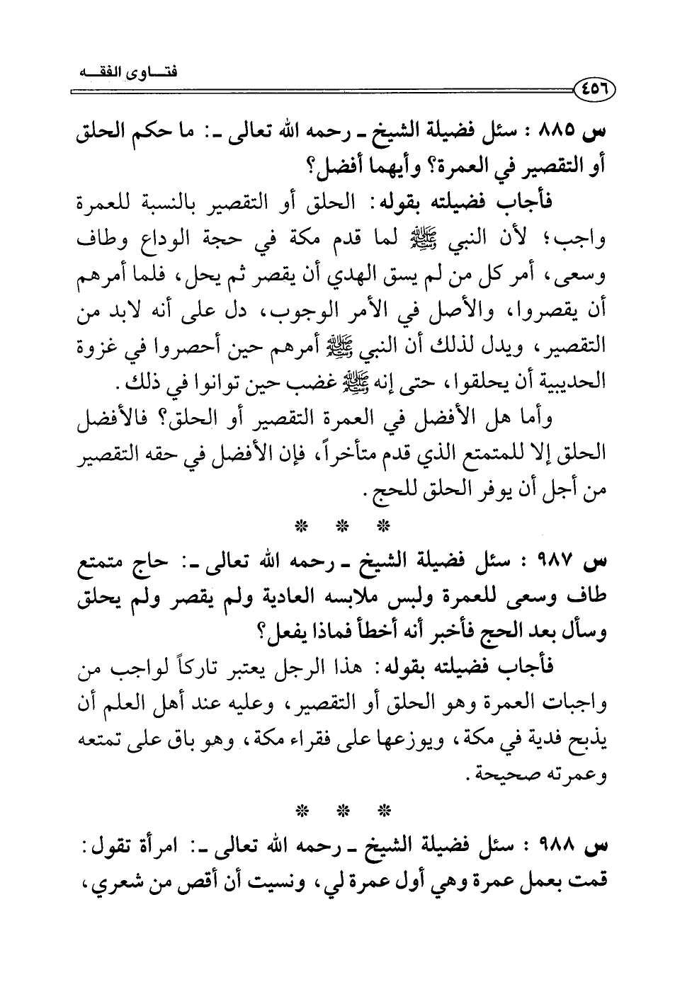 س 986: سئل فضيلة الشيخ- رحمه الله تعالى-: ما حكم الحلق أو التقصير في العمرة؟ وأيهما أفضل؟