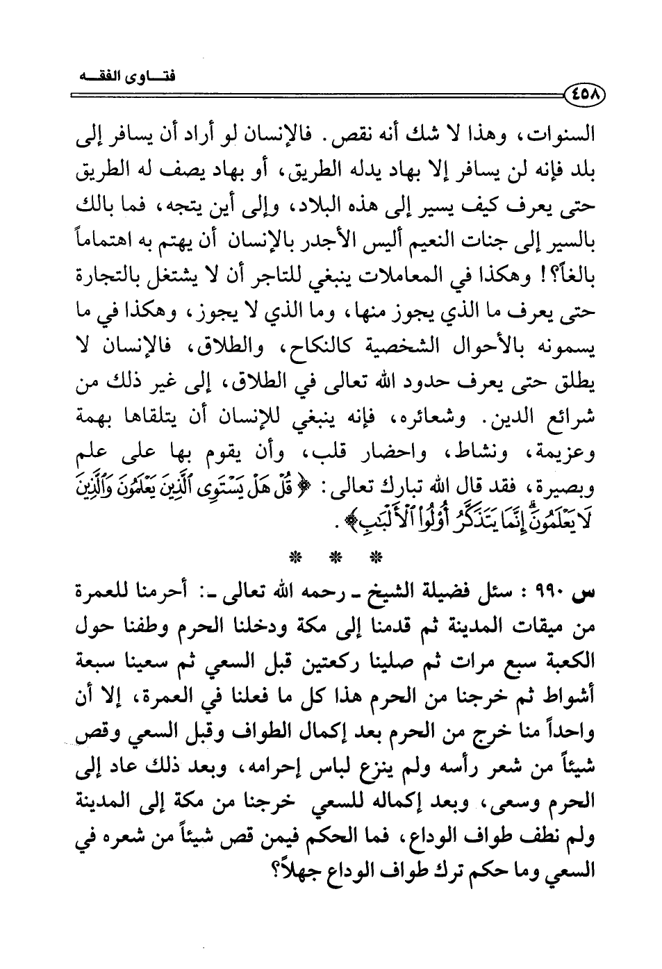 يسمونه بالأحوال الشخصية كالنكاح، والطلاق، فالإنسان لا يطلق حتى يعرف حدود الله تعالى في الطلاق، إلى غير ذلك من شرائع الدين. وشعائره، فإنه ينبغي للإنسان أن يتلقاها بهمة وعزيمة، ونشاط، واحضار قلب، وأن يقوم بها على علمِ وبصيرة، فقد قال الله تبارك تعالى: (قُلْ هَلْ يَسْتَوِي الَّذِينَ يَعْلَمُونَ وَالَّذِينَ لَا يَعْلَمُونَ إِنَّمَا يَتَذَكَّرُ أُولُو الْأَلْبَابِ) .