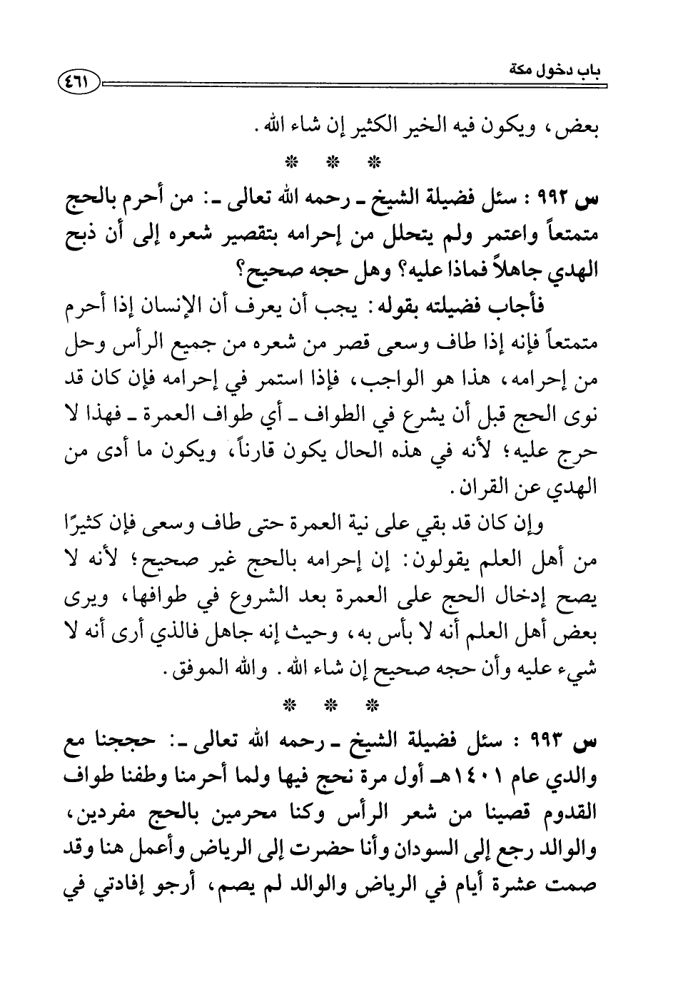 س 993: سئل فضيلة الشيخ- رحمه الله تعالى-: حججنا مع والدي عام 1401 هـ أول مرة نحج فيها ولما أحرمنا وطفنا طواف القدوم قصينا من شعر الرأس وكنا محرمين بالحج مفردين، والوالد رجع إلى السودان وأنا حضرت إلى الرياض وأعمل هنا وقد صمت عشرة أيام في الرياض والوالد لم يصم، أرجو إفادتي في