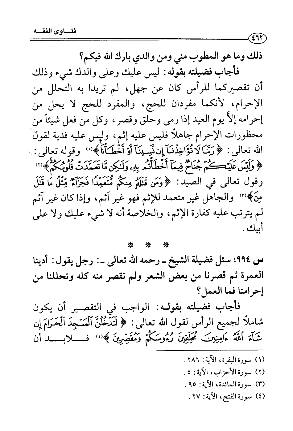 فأجاب فضيلته بقوله: ليس عليك وعلى والدك شيء وذلك أن تقصيركما للرأس كان عن جهل، لم تريدا به التحلل من الإحرام، لأنكما مفردان للحج، والمفرد للحج لا يحل من إحرامه إلاَّ يوم العيد إذا رمى وحلق وقصر، وكل من فعل شيئاً من محظورات الإحرام جاهلاً فليس عليه إثم، وليس عليه فدية لقوك الله تعالى: (رَبَّنَا لَا تُؤَاخِذْنَا إِنْ نَسِينَا أَوْ أَخْطَأْنَا) (1) وقوله تعالى: (وَلَيْسَ عَلَيْكُمْ جُنَاحٌ فِيمَا أَخْطَأْتُمْ بِهِ وَلَكِنْ مَا تَعَمَّدَتْ قُلُوبُكُمْ) (2) وقوله تعالى في الصيد: (وَمَنْ قَتَلَهُ مِنْكُمْ مُتَعَمِّدًا فَجَزَاءٌ مِثْلُ مَا قَتَلَ مِنَ النَّعَمِ) (3) والجاهل غير متعمد للإثم فهو غير آثم، وإذا كان غير آثم