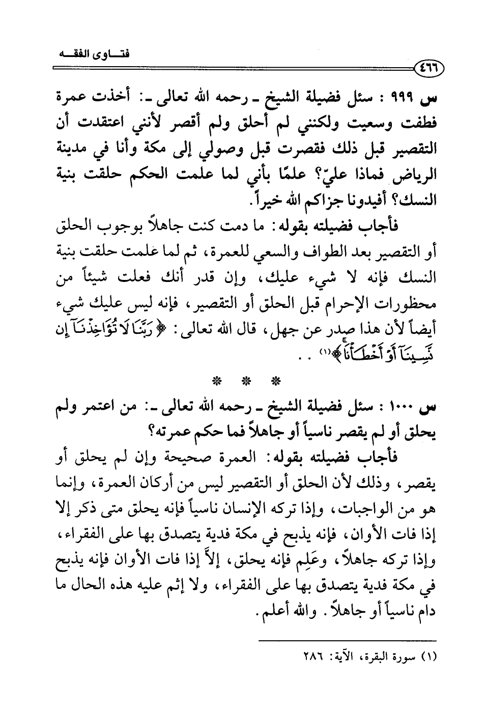 فأجاب فضيلته بقوله: ما دمت كنت جاهلاً بوجوب الحلق أو التقصير بعد الطواف والسعي للعمرة، ثم لما علمت حلقت بنية النسك فإنه لا شيء عليك، وإن قدر أنك فعلت شيئاً من