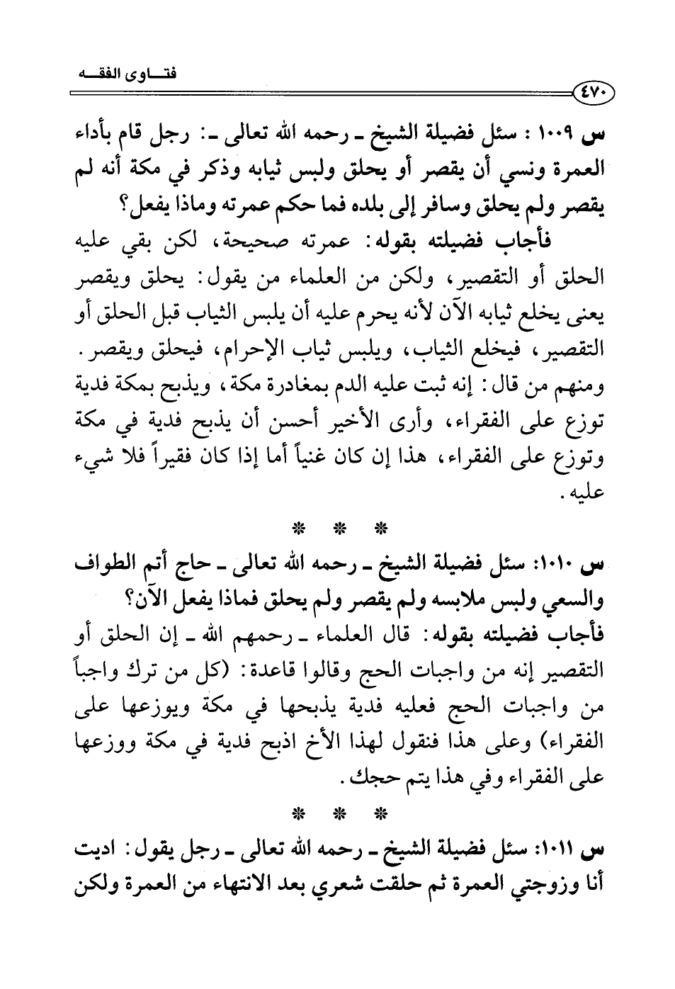 س 1011: سئل فضيلة الشيخ- رحمه الله تعالى- رجل يقول: اديت أنا وزوجتي العمرة ثم حلقت شعري بعد الانتهاء من العمرة ولكن