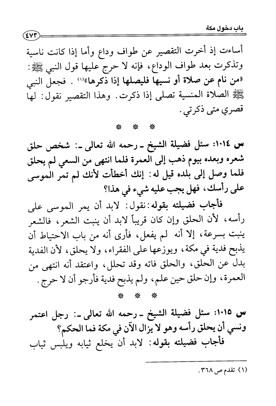 س 1014: سئل فضيلة الشيخ- رحمه الله تعالى-: شخص حلق شعره وبعده بيوم ذهب إلى العمرة فلما انتهى من السعي لم يحلق فلما وصل إلى بلده قيل له: إنك أخطأت لأنك لم تمر الموسى