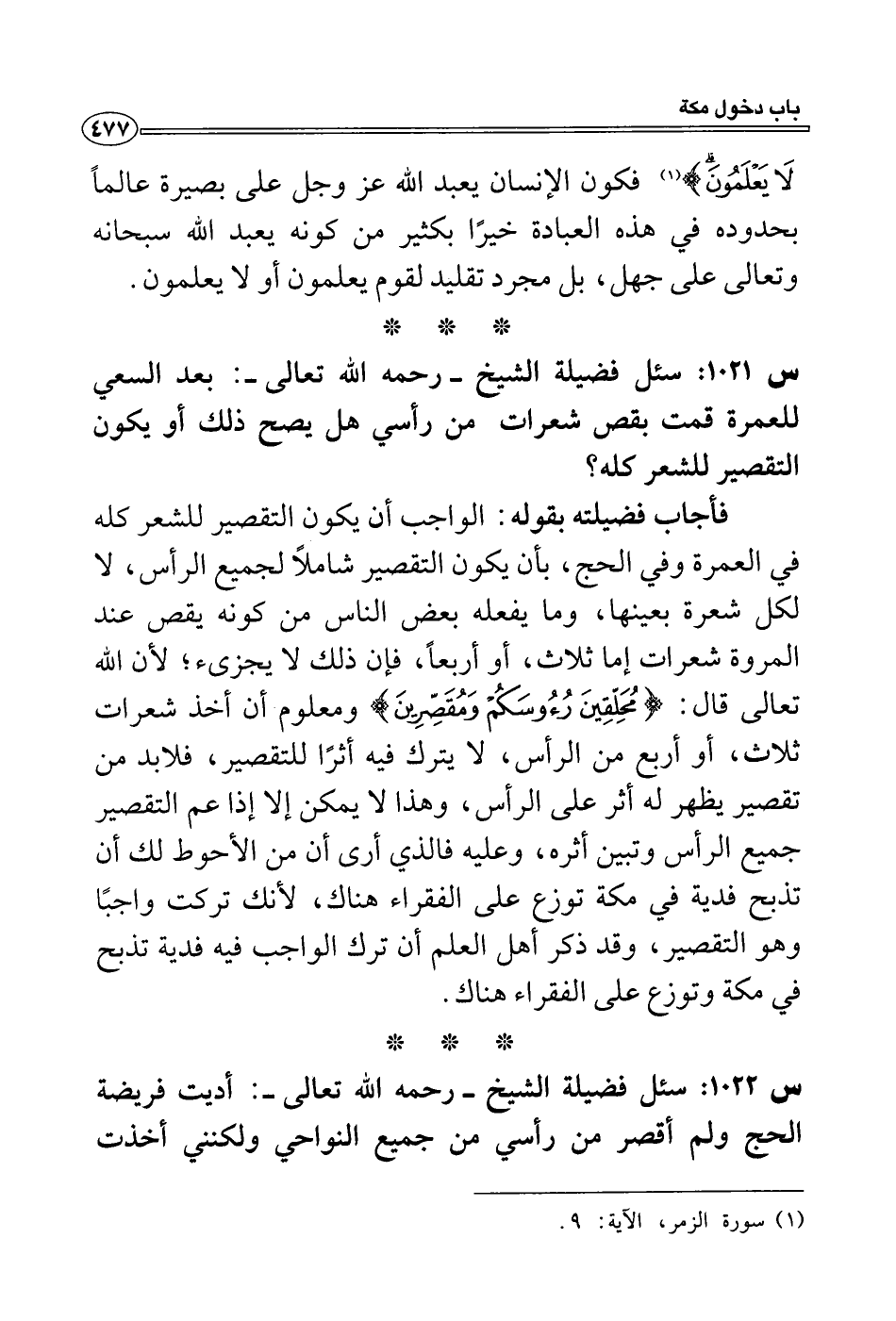 س 1021: سئل فضيلة الشيخ- رحمه الله تعالى-: بعد السعي للعمرة قمت بقص شعرات من رأسي هل يصح ذلك أو يكون التقصير للشعر كله؟