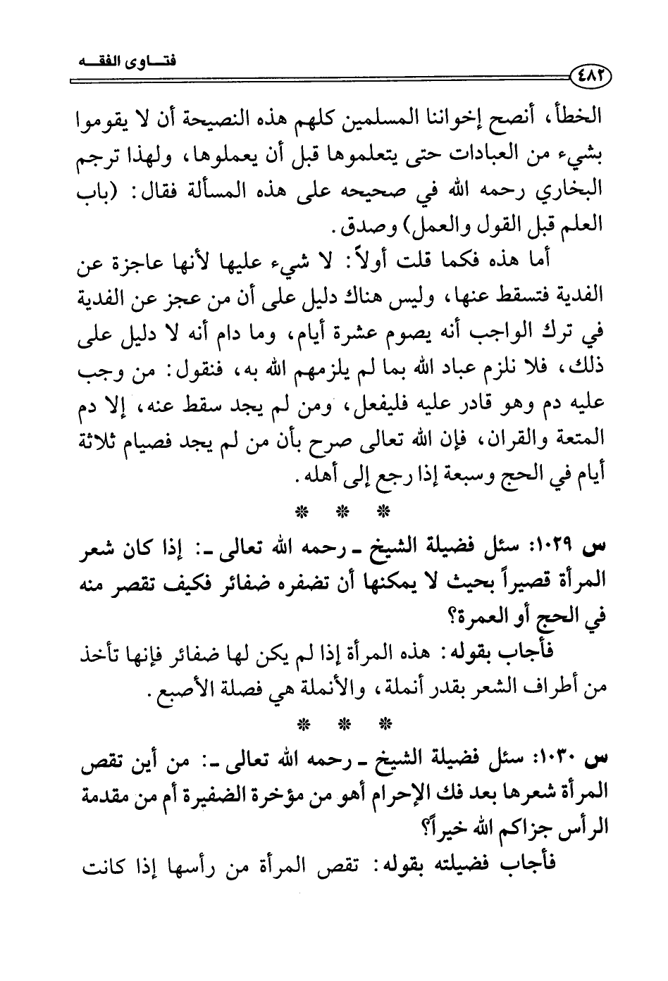 س 1029: سئل فضيلة الشيخ- رحمه الله تعالى-: إذا كان شعر المرأة قصيراً بحيث لا يمكنها أن تضفره ضفائر فكيف تقصر منه في الحج أو العمرة؟