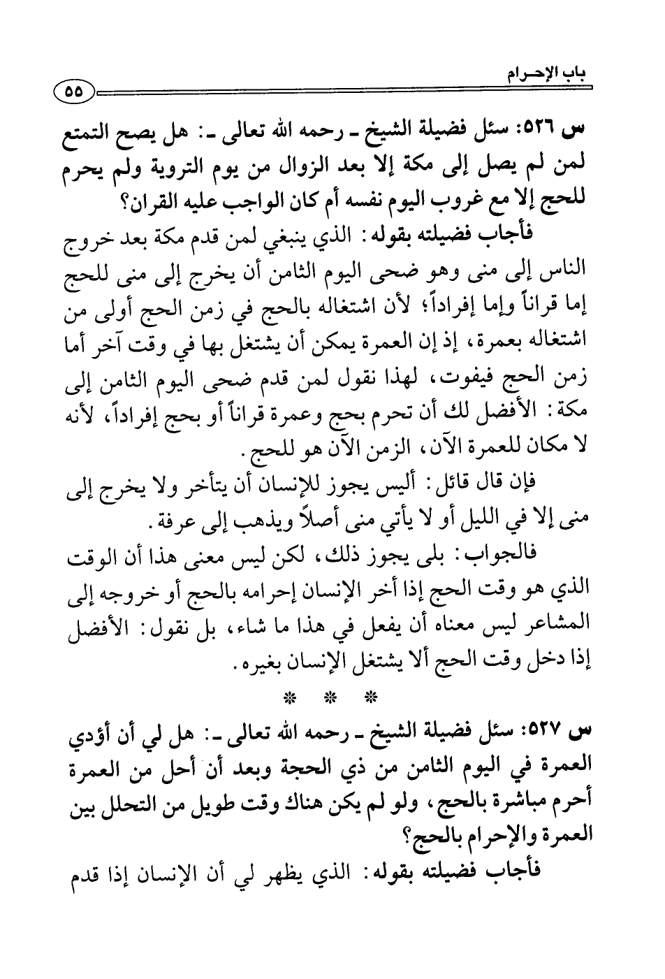 س 527: سئل فضيلة الشيخ- رحمه الله تعالى-: هل لي أن أؤدي العمرة في اليوم الثامن من ذي الحجة وبعد أن أحل من العمرة أحرم مباشرة بالحج، ولو لم يكن هناك وقت طويل من التحلل بين