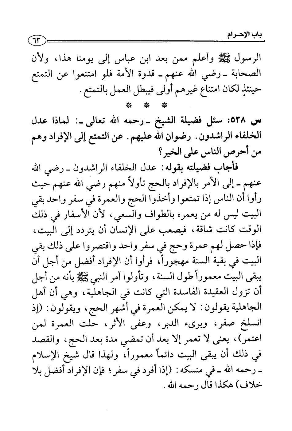البيت في بقية السنة مهجوراً، فرأوا أن الإفراد أفضل من أجل أن يبقى البيت معموراً طول السنة، وتأولوا أمر النبي - صلى الله عليه وسلم - بأنه من أجل أن تزول العقيدة الفاسدة التي كانت في الجاهلية، وهي أن أهل الجاهلية يقولون: لا يمكن العمرة في أشهر الحج، ويقولون: (إذ انسلخ صفر، وبرىء الدبر، وعفى الأثر، حلت العمرة لمن اعتمر) ، يعنى لا تعمر إلا بعد أن تمضي مدة بعد الحج، والقصد في ذلك أن يبقى البيت دائماً معموراً، ولهذا قال شيخ الإسلام - رحمه الله- في منسكه: (إذا أفرد في سفر؛ فإن الإفراد أفضل بلا خلاف) هكذا قال رحمه الله.