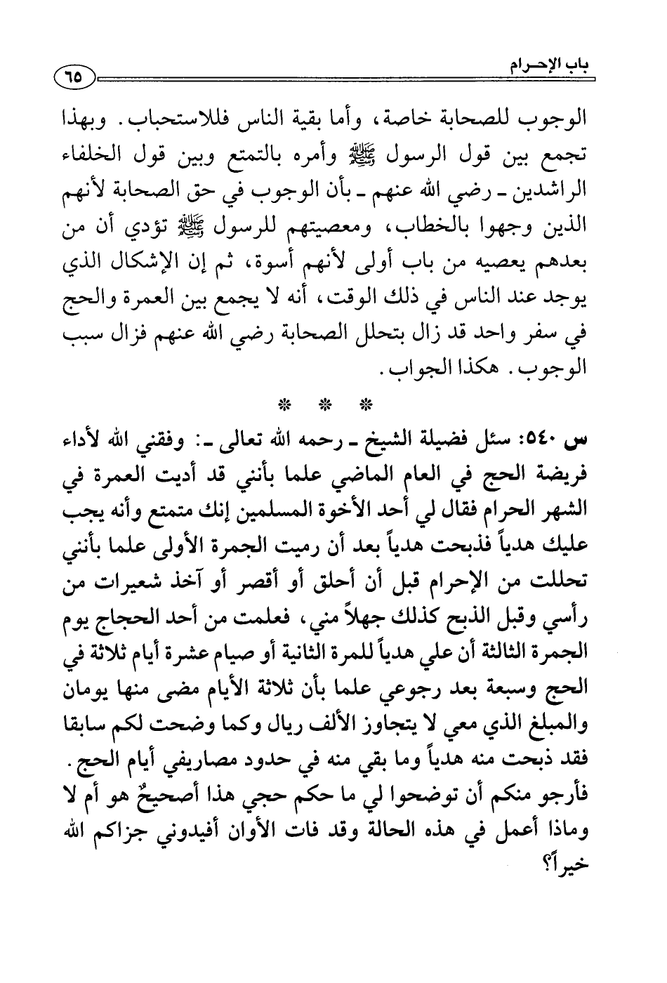 س 540: سئل فضيلة الشيخ- رحمه الله تعالى-: وفقني الله لأداء فريضة الحج في العام الماضي علما بأنني قد أديت العمرة في الشهر الحرام فقال لي أحد الأخوة المسلمين إنك متمتع وأنه يجب عليك هدياً فذبحت هدياً بعد أن رميت الجمرة الأولى علما بأنني تحللت من الإحرام قبل أن أحلق أو أقصر أو آخذ شعيرات من رأسي وقبل الذبح كذلك جهلاً مني، فعلمت من أحد الحجاج يوم الجمرة الثالثة أن علي هدياً للمرة الثانية أو صيام عشرة أيام ثلاثة في الحج وسبعة بعد رجوعي علما بأن ثلاثة الأيام مضى منها يومان والمبلغ الذي معي لا يتجاوز الألف ريال وكما وضحت لكم سابقا