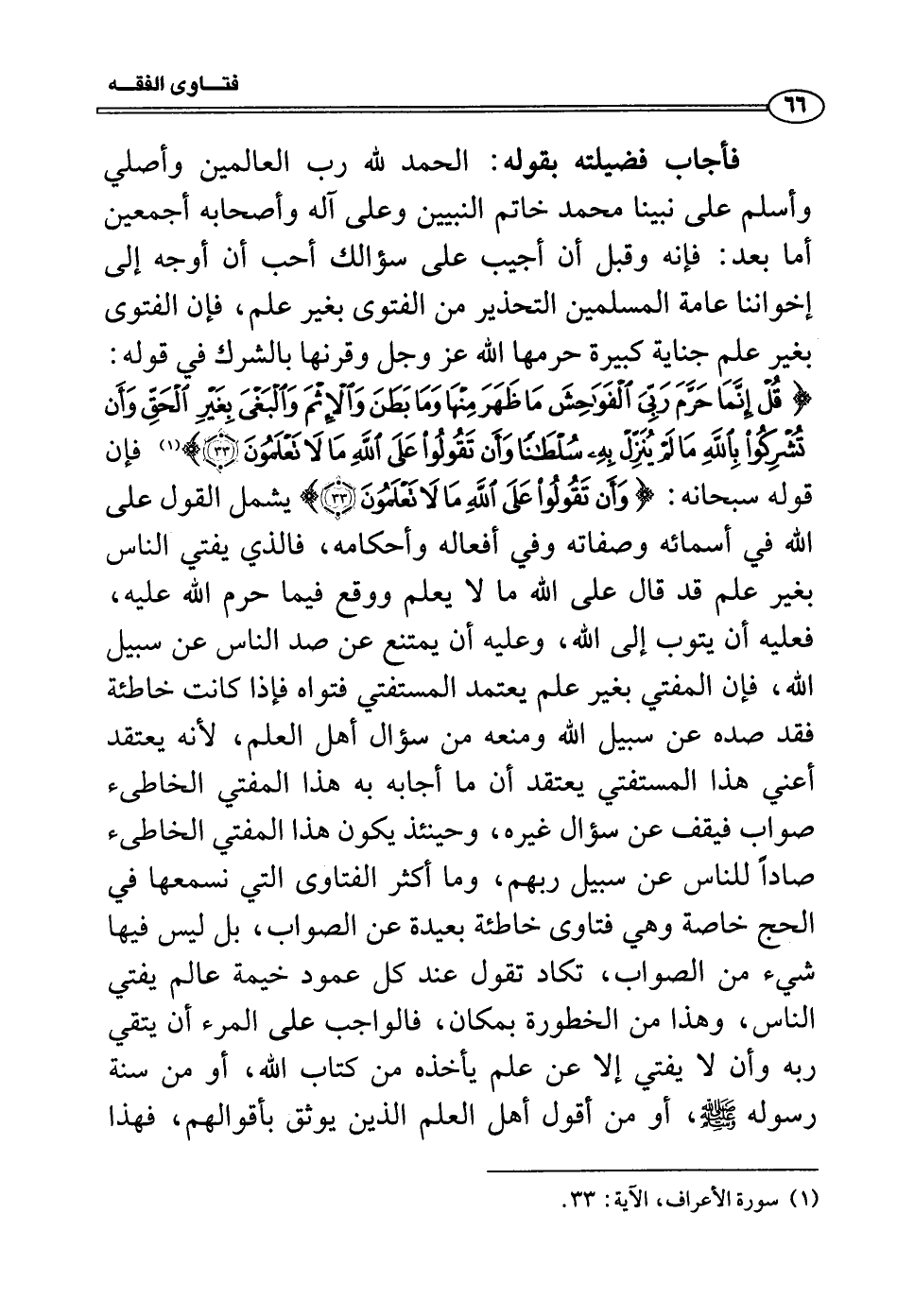 فأجاب فضيلته بقوله: الحمد لله رب العالمين وأصلي وأسلم على نبينا محمد خاتم النبيين وعلى آله وأصحابه أجمعين أما بعد: فإنه وقبل أن أجيب على سؤالك أحب أن أوجه إلى إخواننا عامة المسلمين التحذير من الفتوى بغير علم، فإن الفتوى بغير علم جناية كبيرة حرمها الله عز وجل وقرنها بالشرك في قوله: (قُلْ إِنَّمَا حَرَّمَ رَبِّيَ الْفَوَاحِشَ مَا ظَهَرَ مِنْهَا وَمَا بَطَنَ وَالْإِثْمَ وَالْبَغْيَ بِغَيْرِ الْحَقِّ وَأَنْ تُشْرِكُوا بِاللَّهِ مَا لَمْ يُنَزِّلْ بِهِ سُلْطَانًا وَأَنْ تَقُولُوا عَلَى اللَّهِ مَا لَا تَعْلَمُونَ) (1) فإن قوله سبحانه: (وَأَنْ تَقُولُوا عَلَى اللَّهِ مَا لَا تَعْلَمُونَ) يشمل القول على الله في أسمائه وصفاته وفي أفعاله وأحكامه، فالذي يفتي الناس بغير علم قد قال على الله ما لا يعلم ووقع فيما حرم الله عليه، فعليه أن يتوب إلى الله، وعليه أن يمتنع عن صد الناس عن سبيل الله، فإن المفتي بغير علم يعتمد المستفتي فتواه فإذا كانت خاطئة