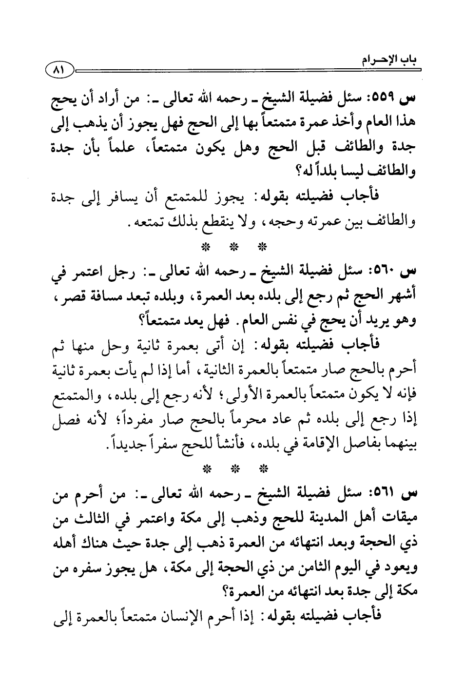 س 561: سئل فضيلة الشيخ- رحمه الله تعالى-: من أحرم من ميقات أهل المدينة للحج وذهب إلى مكة واعتمر في الثالث من ذي الحجة وبعد انتهائه من العمرة ذهب إلى جدة حيث هناك أهله