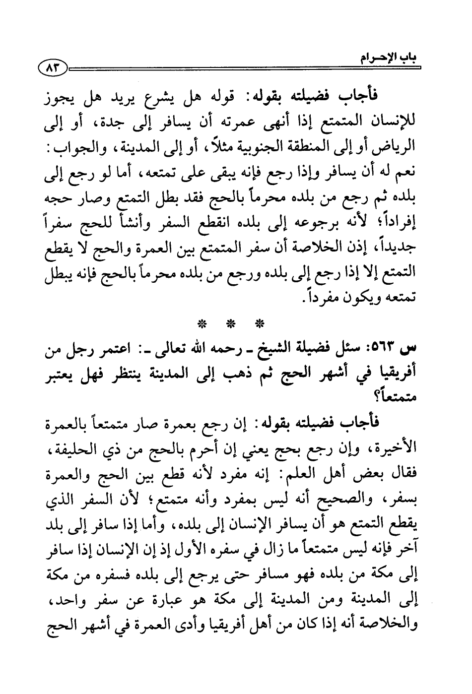 فأجاب فضيلته بقوله: قوله هل يشرع يريد هل يجوز للإنسان المتمتع إذا أنهى عمرته أن يسافر إلى جدة، أو إلى الرياض أو إلى المنطقة الجنوبية مثلاً، أو إلى المدينة، والجواب: نعم له أن يسافر وإذا رجع فإنه يبقى على تمتعه، أما لو رجع إلى بلده ثم رجع من بلده محرماً بالحج فقد بطل التمتع وصار حجه إفراداً؛ لأنه برجوعه إلى بلده انقطع السفر وأنشأ للحج سفراً جديداً، إذن الخلاصة أن سفر المتمتع بين العمرة والحج لا يقطع التمتع إلا إذا رجع إلى بلده ورجع من بلده محرماً بالحج فإنه يبطل