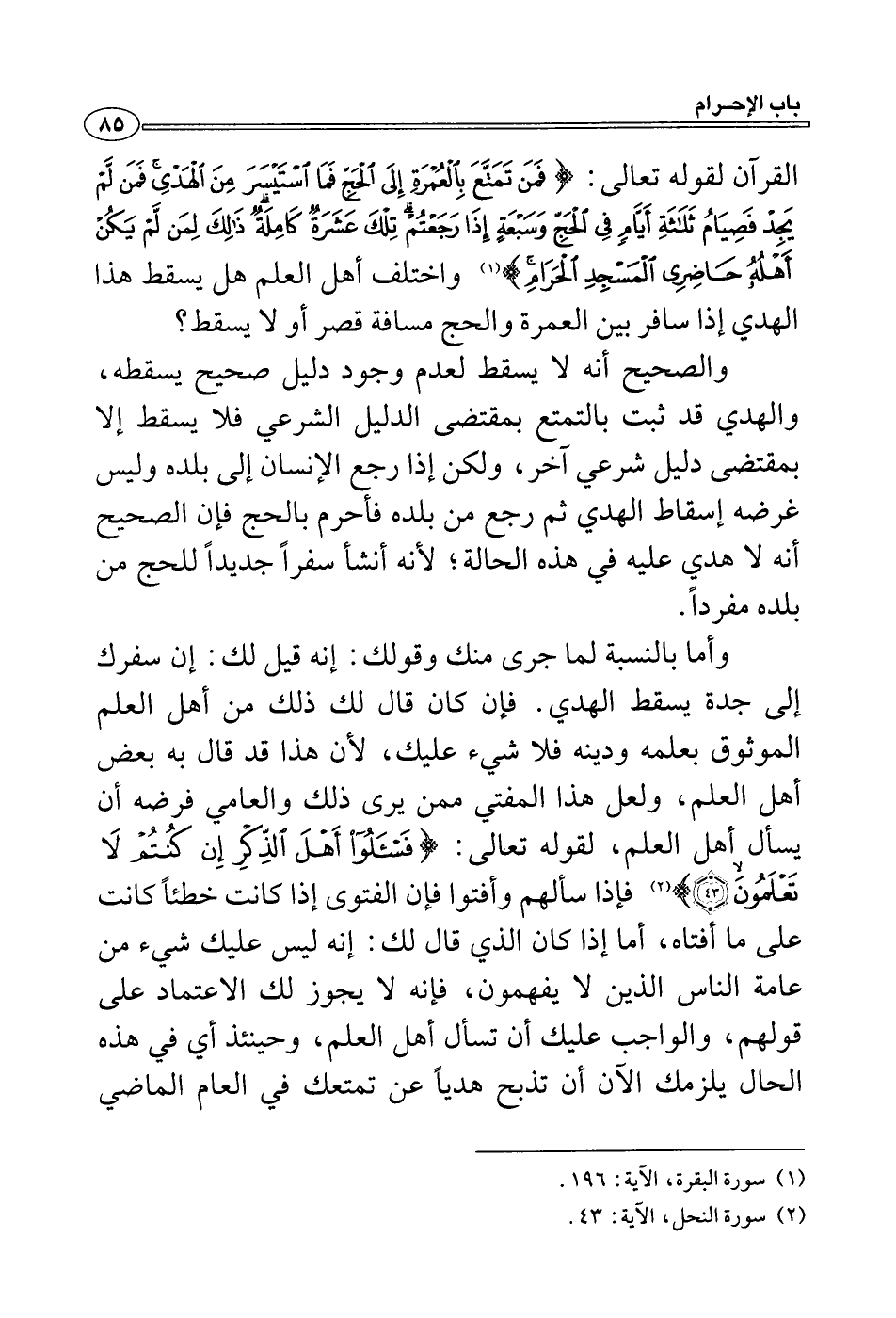 وأما بالنسبة لما جرى منك وقولك: إنه قيل لك: إن سفرك إلى جدة يسقط الهدي. فإن كان قال لك ذلك من أهل العلم الموثوق بعلمه ودينه فلا شيء عليك، لأن هذا قد قال به بعض أهل العلم، ولعل هذا المفتي ممن يرى ذلك والعامي فرضه أن يسأل أهل العلم، لقوله تعالى: فَاسْأَلُوا أَهْلَ الذِّكْرِ إِنْ كُنْتُمْ لَا تَعْلَمُونَ) (2) فإذا سألهم وأفتوا فإن الفتوى إذا كانت خطئاً كانت على ما أفتاه، أما إذا كان الذي قال لك: إنه ليس عليك شيء من عامة الناس الذين لا يفهمون، فإنه لا يجوز لك الاعتماد على قولهم، والواجب عليك أن تسأل أهل العلم، وحينئذ أي في هذه الحال يلزمك الآن أن تذبح هدياً عن تمتعك في العام الماضي