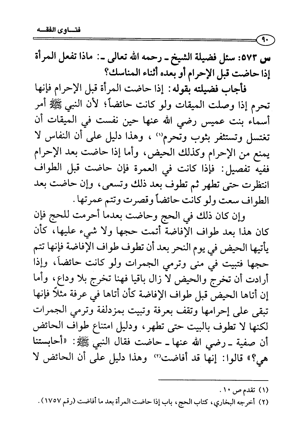 س 573: سئل فضيلة الشيخ- رحمه الله تعالى-: ماذا تفعل المرأة إذا حاضت قبل الإحرام أو بعده أثناء المناسك؟