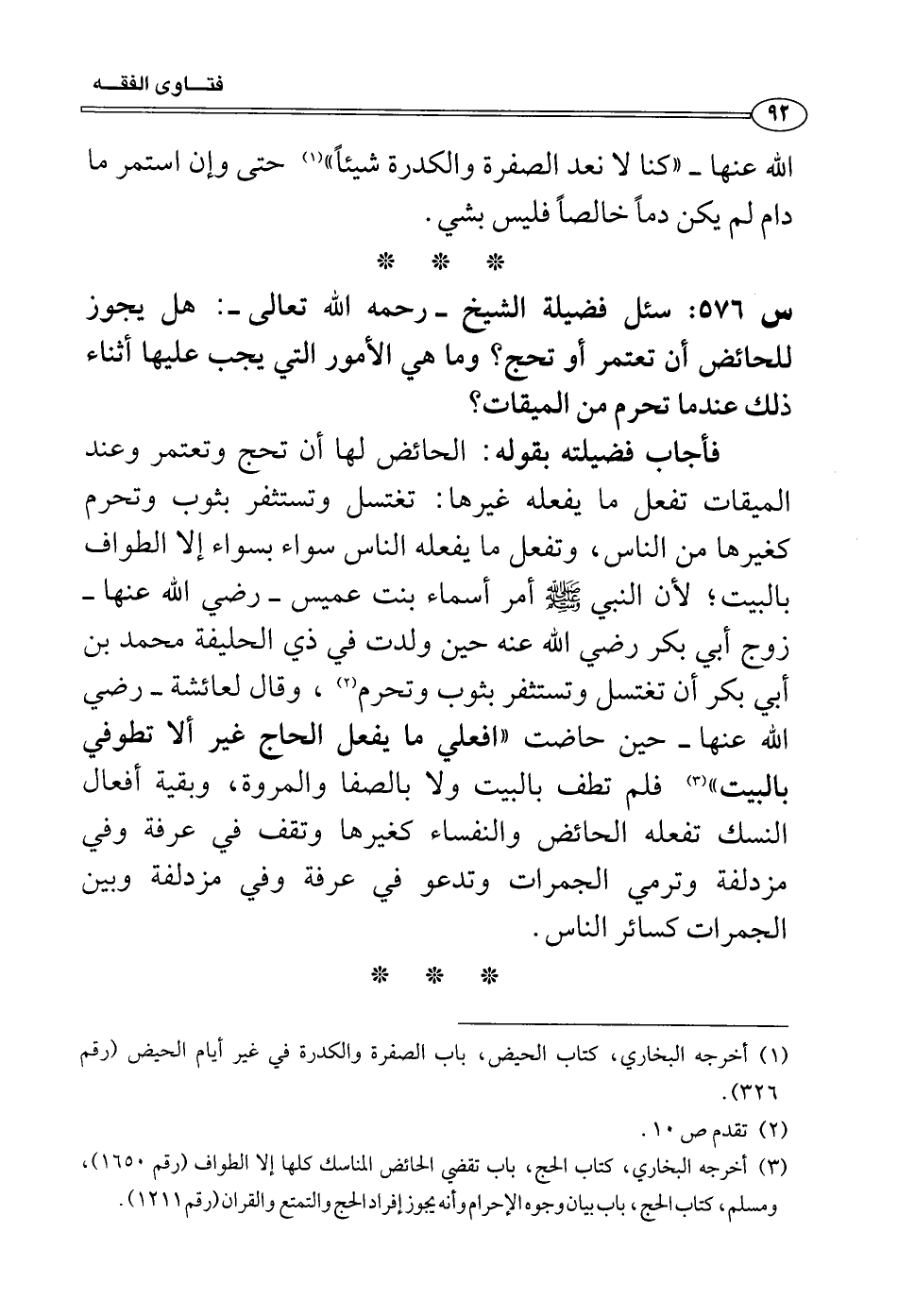 س 576: سئل فضيلة الشيخ- رحمه الله تعالى-: هل يجوز للحائض أن تعتمر أو تحج؟ وما هي الأمور التي يجب عليها أثناء ذلك عندما تحرم من الميقات؟