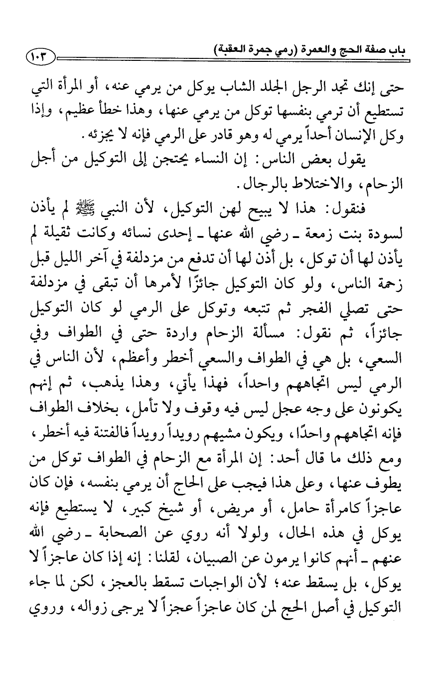 فإنه اتجاههم واحدًا، ويكون مشيهم رويداً رويداً فالفتنة فيه أخطر، ومع ذلك ما قال أحد: إن المرأة مع الزحام في الطواف توكل من يطوف عنها، وعلى هذا فيجب على الحاج أن يرمي بنفسه، فإن كان عاجزاً كامرأة حامل، أو مريض، أو شيخ كبير، لا يستطيع فإنه يوكل في هذه الحال، ولولا أنه روي عن الصحابة- رضي الله عنهم- أنهم كانوا يرمون عن الصبيان، لقلنا: إنه إذا كان عاجزاً لا