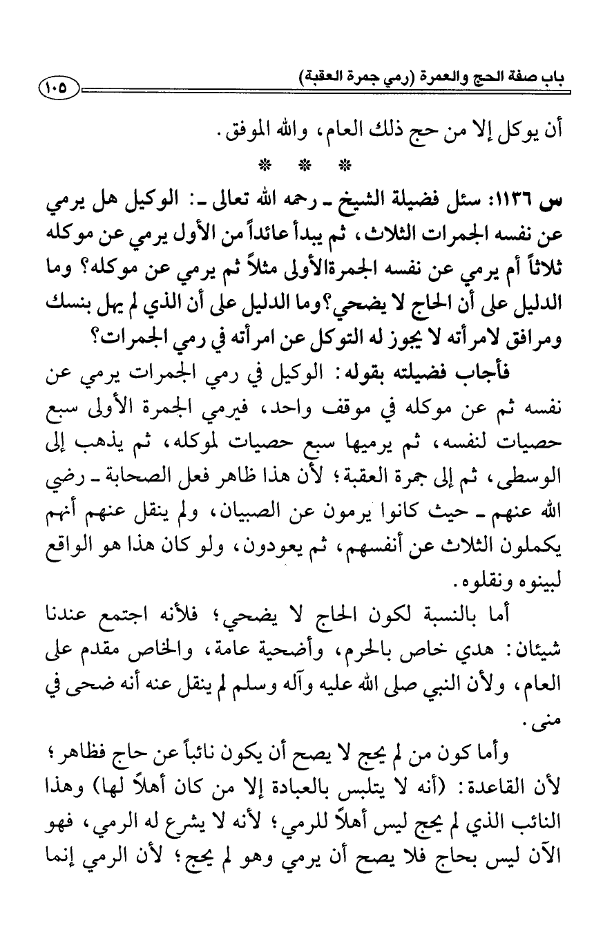 س1136: سئل فضيلة الشيخ- رحمه الله تعالى-: الوكيل هل يرمي عن نفسه الجمرات الثلاث، ثم يبدأ عائداً من الأول يرمي عن موكله ثلاثاً أم يرمي عن نفسه الجمرة الأولى مثلاً ثم يرمي عن موكله؟ وما الدليل على أن الحاج لا يضحي؟ وما الدليل على أن الذي لم يهل بنسك ومرافق لامرأته لا يجوز له التوكل عن امرأته في رمي الجمرات؟