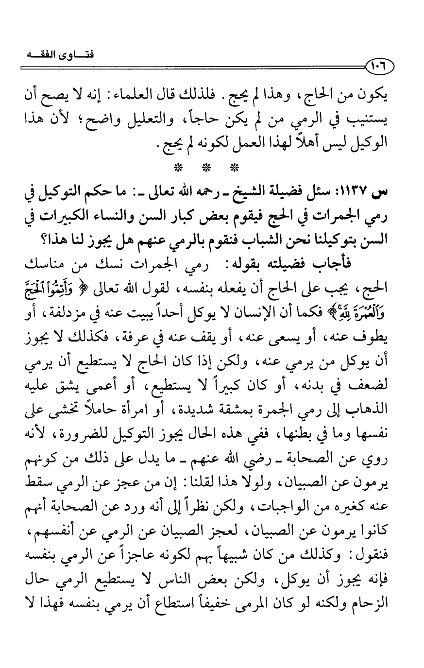 س1137: سئل فضيلة الشيخ- رحمه الله تعالى-: ما حكم التوكيل في رمي الجمرات في الحج فيقوم بعض كبار السن والنساء الكبيرات في السن بتوكيلنا نحن الشباب فنقوم بالرمي عنهم هل يجوز لنا هذا؟